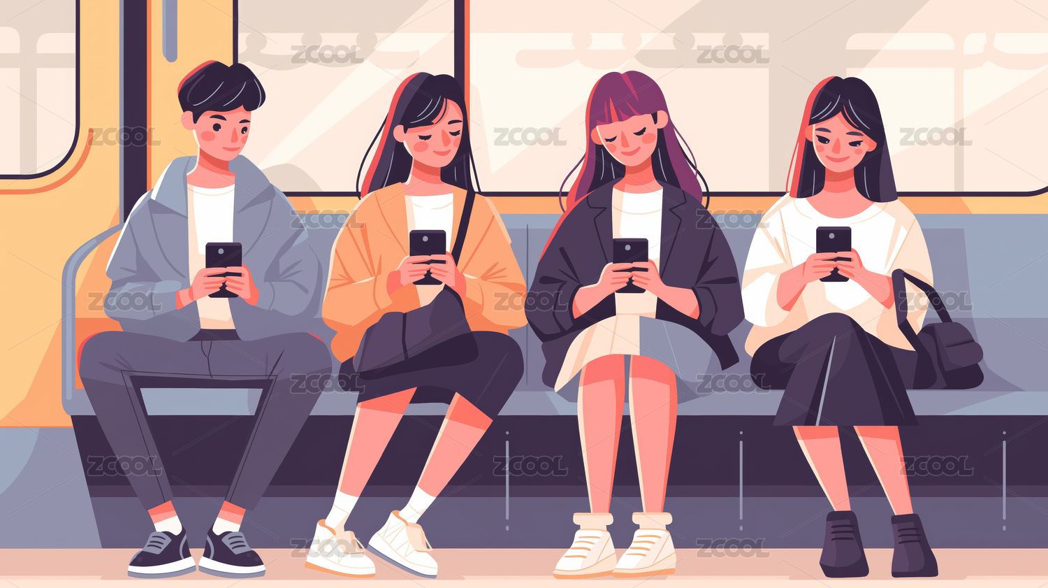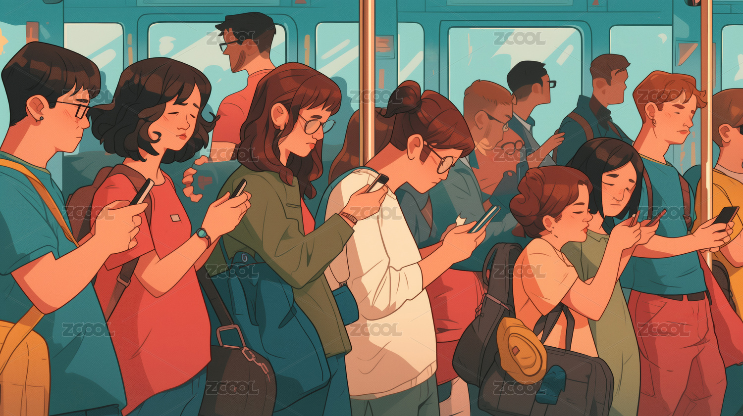 地铁上低头看手机的人物插画