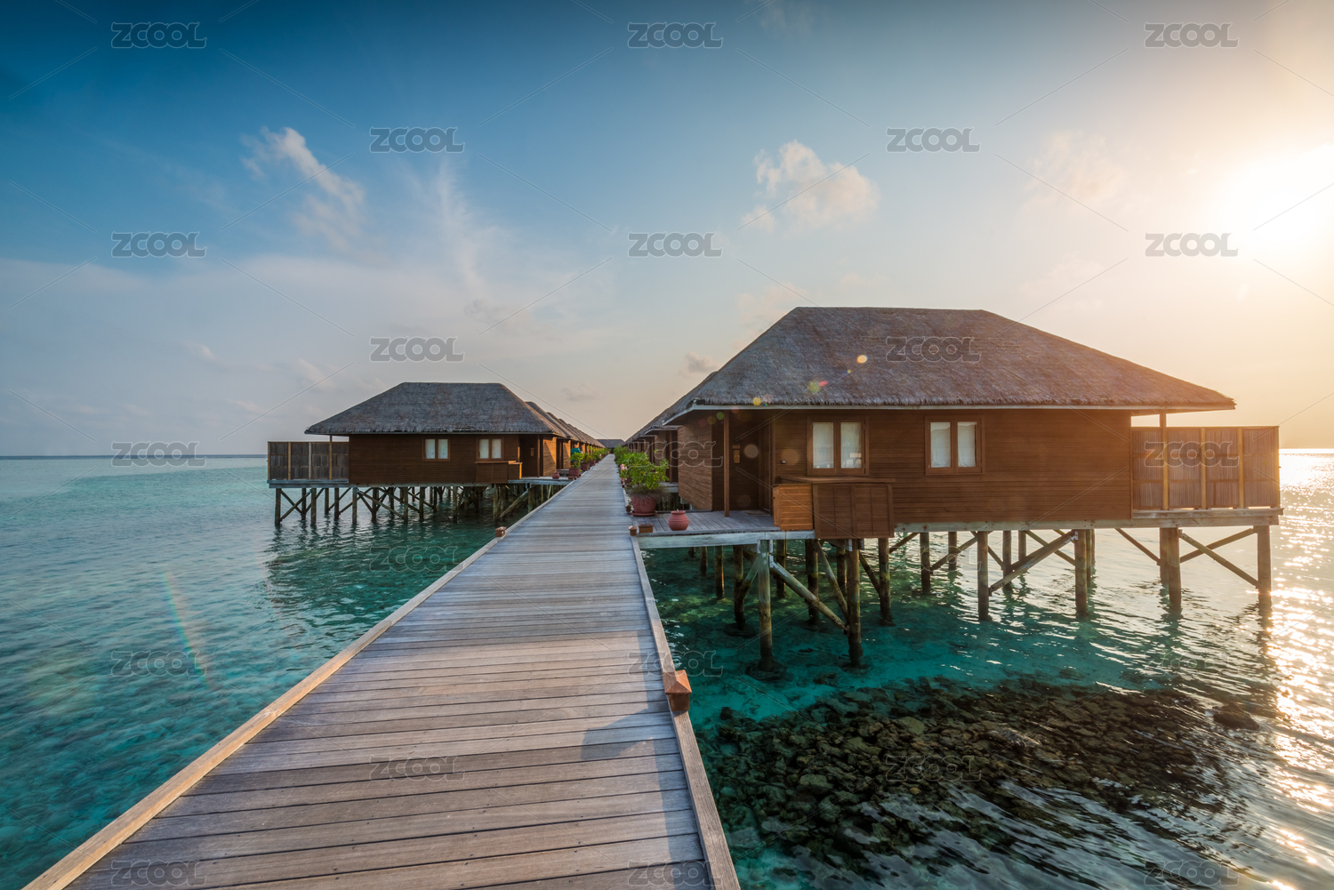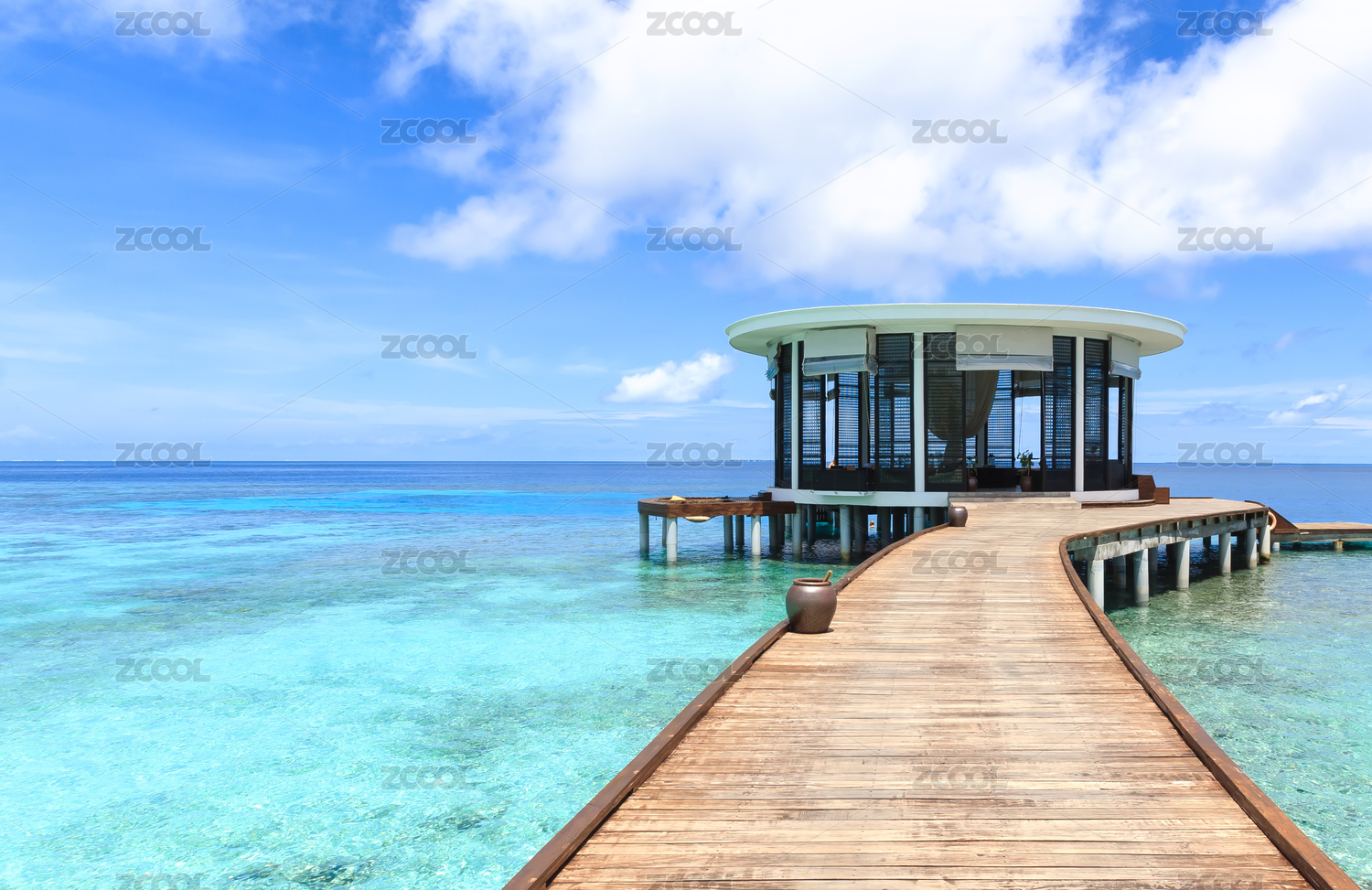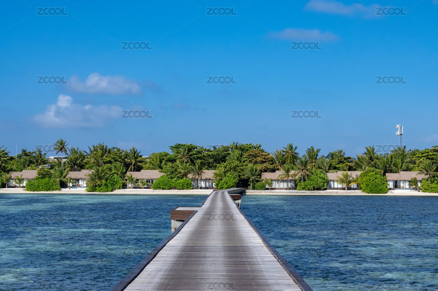 阳光下一条通向马尔代夫海景别墅的木板栈道