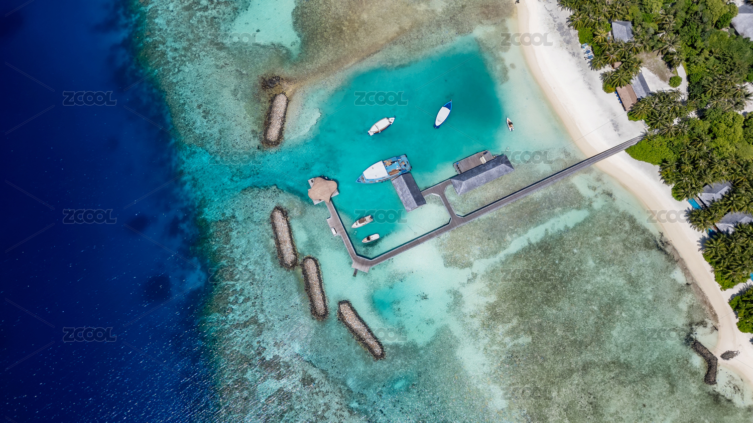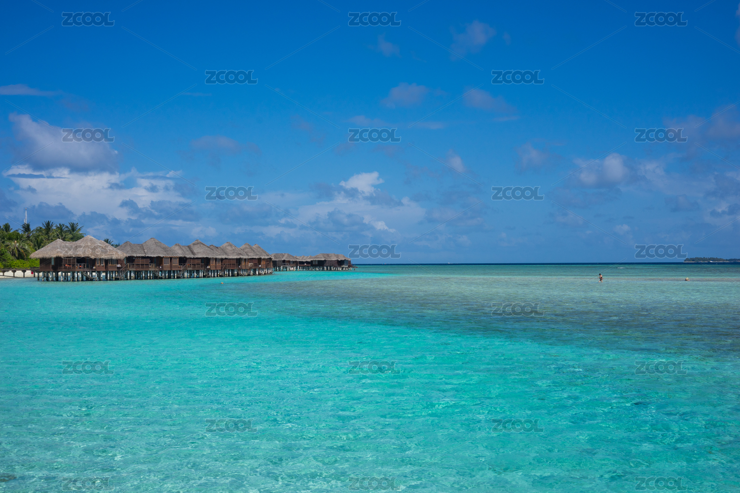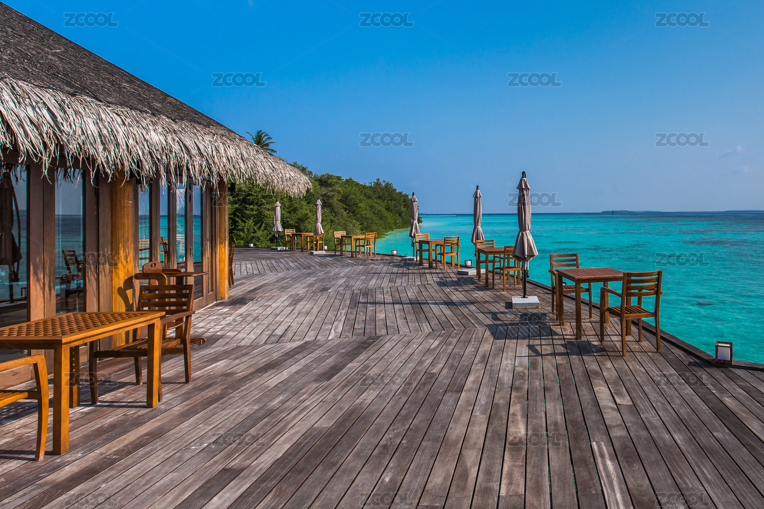 阳光下一条通向马尔代夫海景别墅的木板栈道