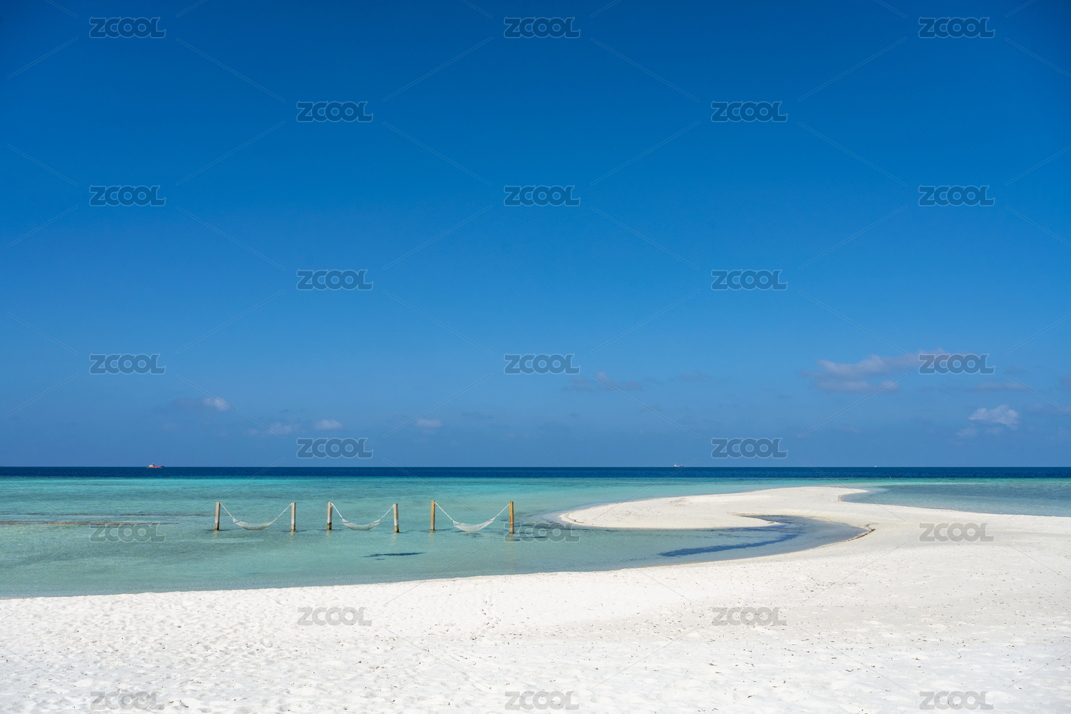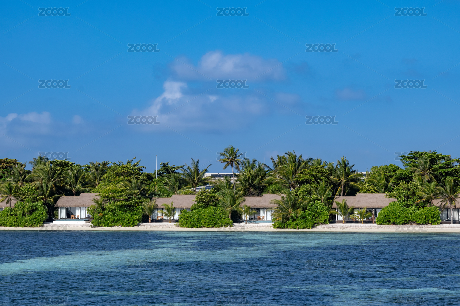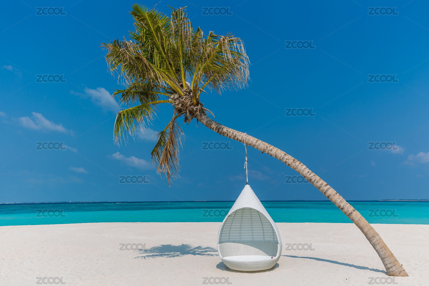 马尔代夫白色沙滩上的休闲躺椅和观景别墅风光