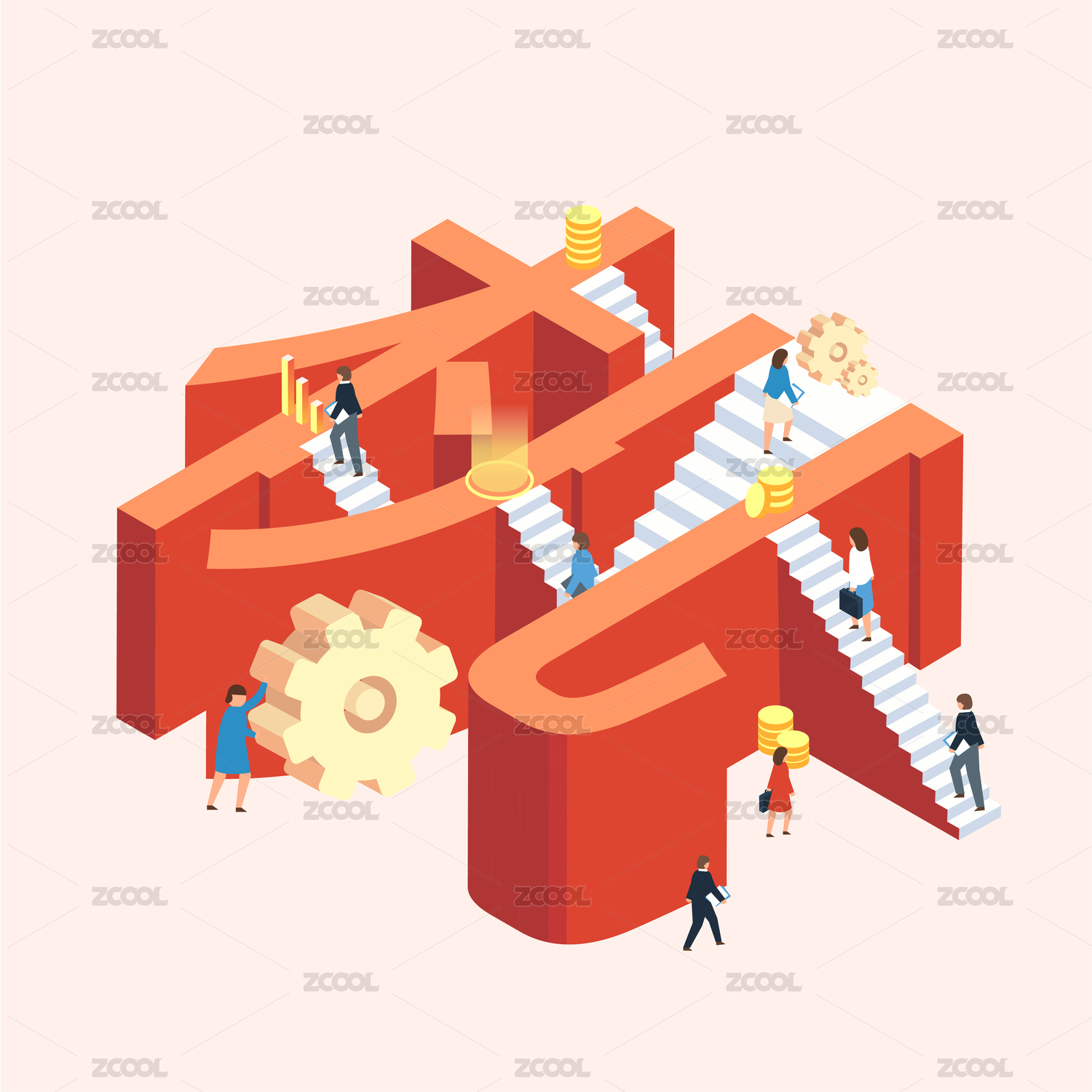 微缩创意梯子人群走向积木云里的钥匙机遇
