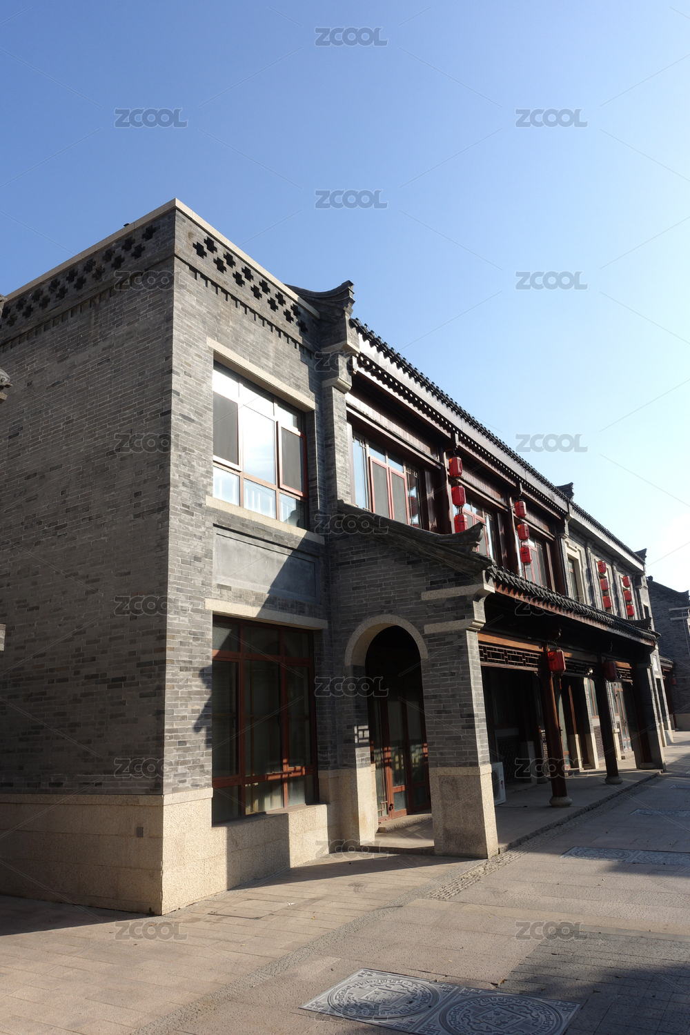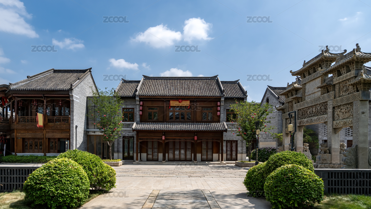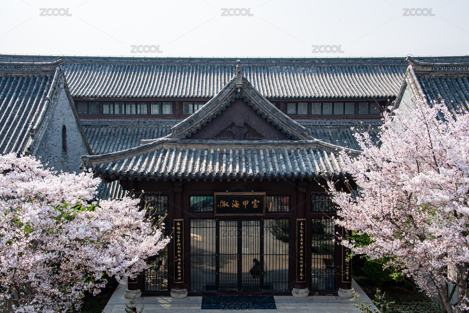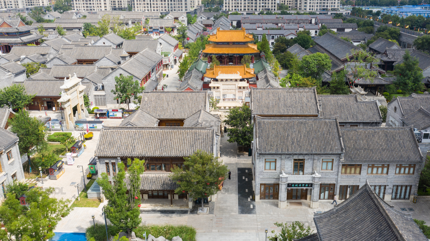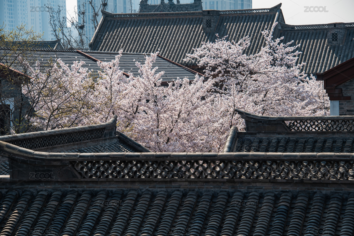 中国山东青岛即墨古城梧桐树叶下的寺庙屋顶