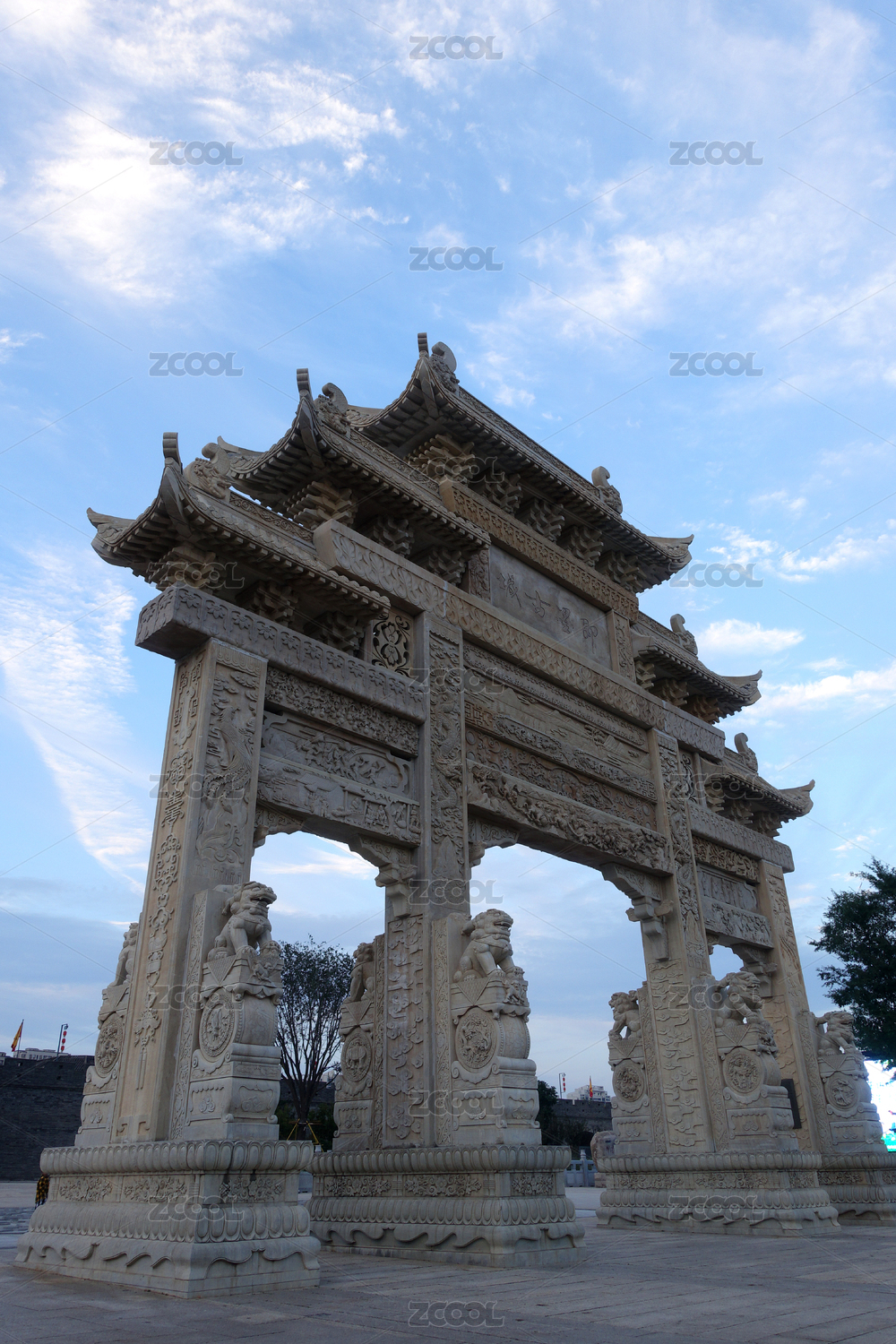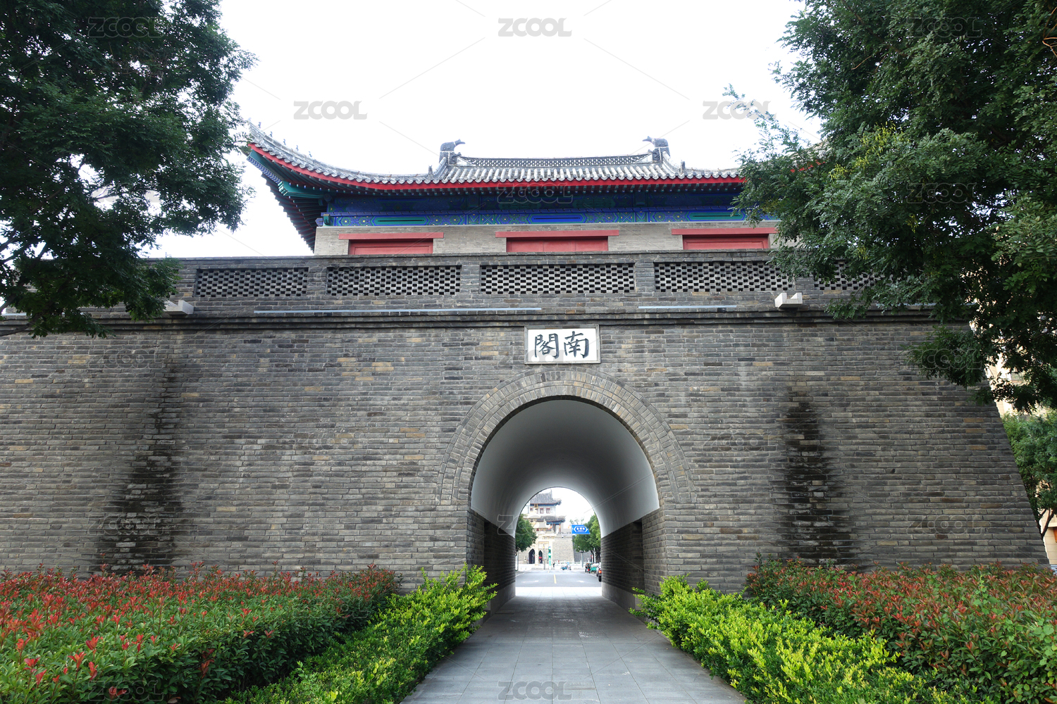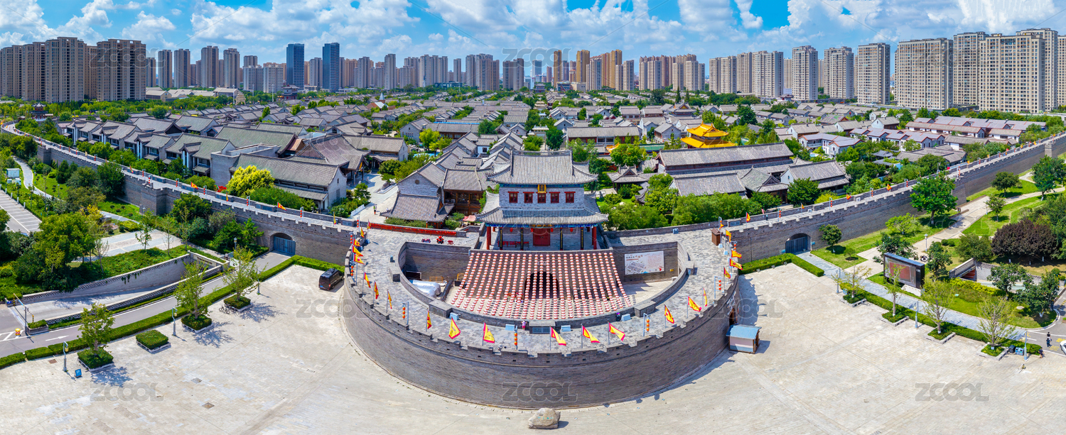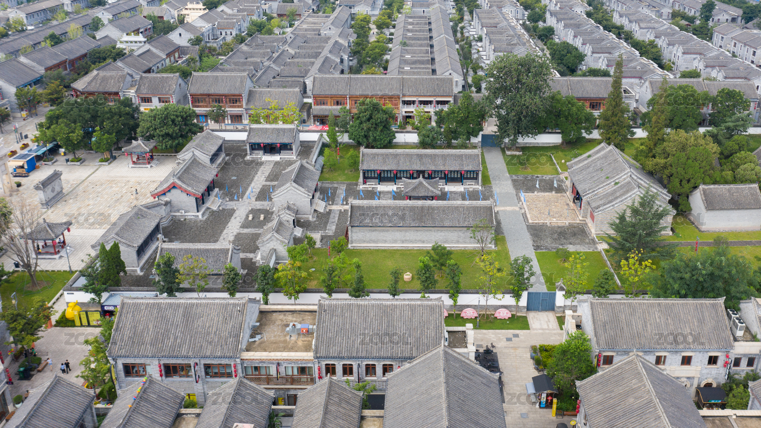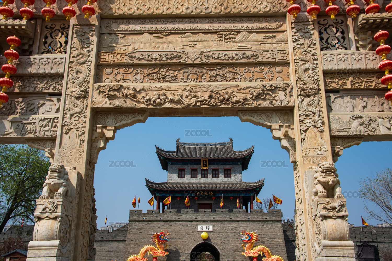 中国山东青岛即墨古城梧桐树叶下的寺庙屋顶