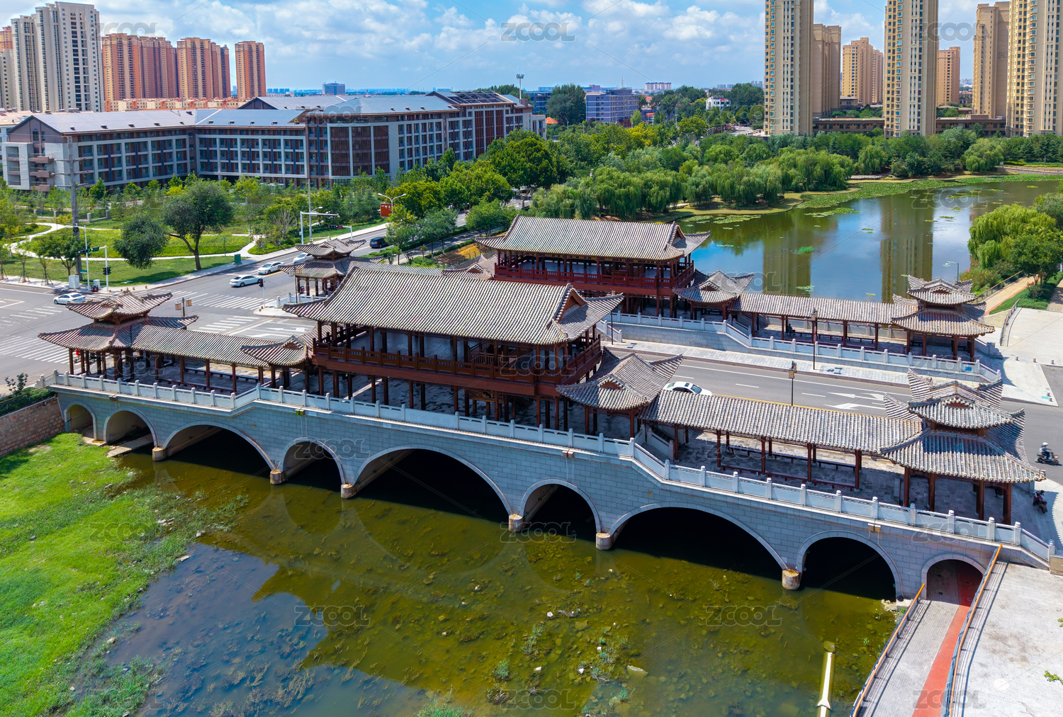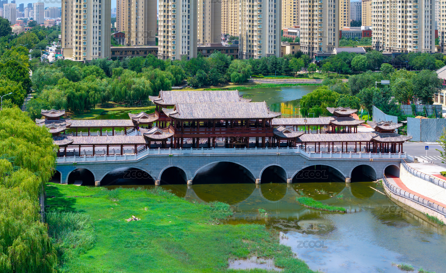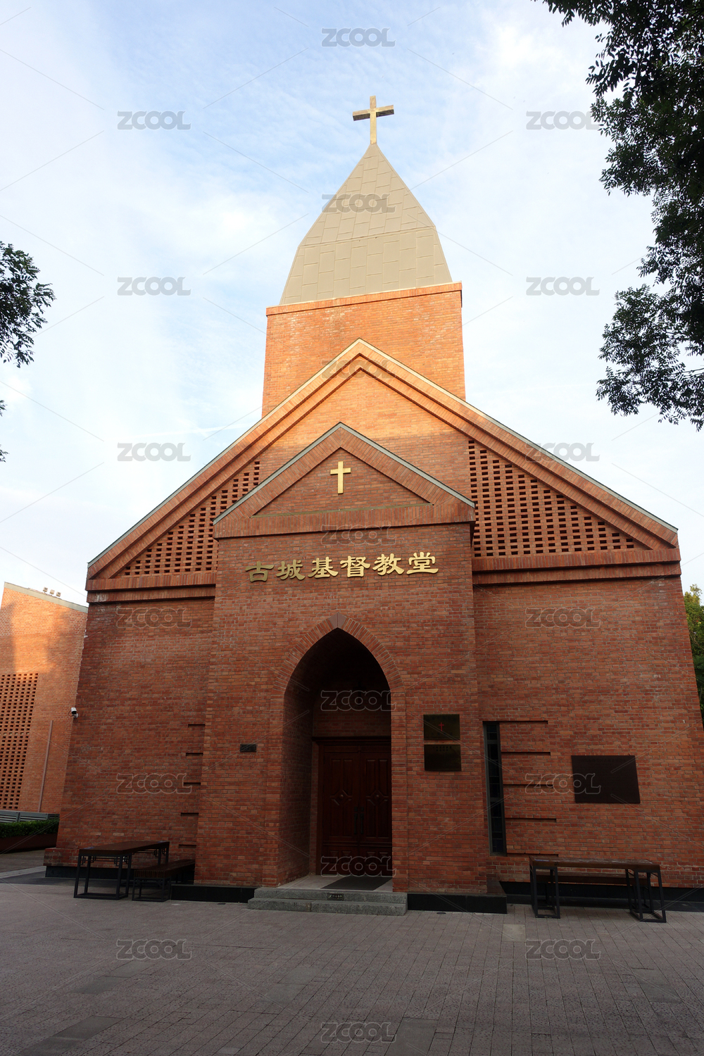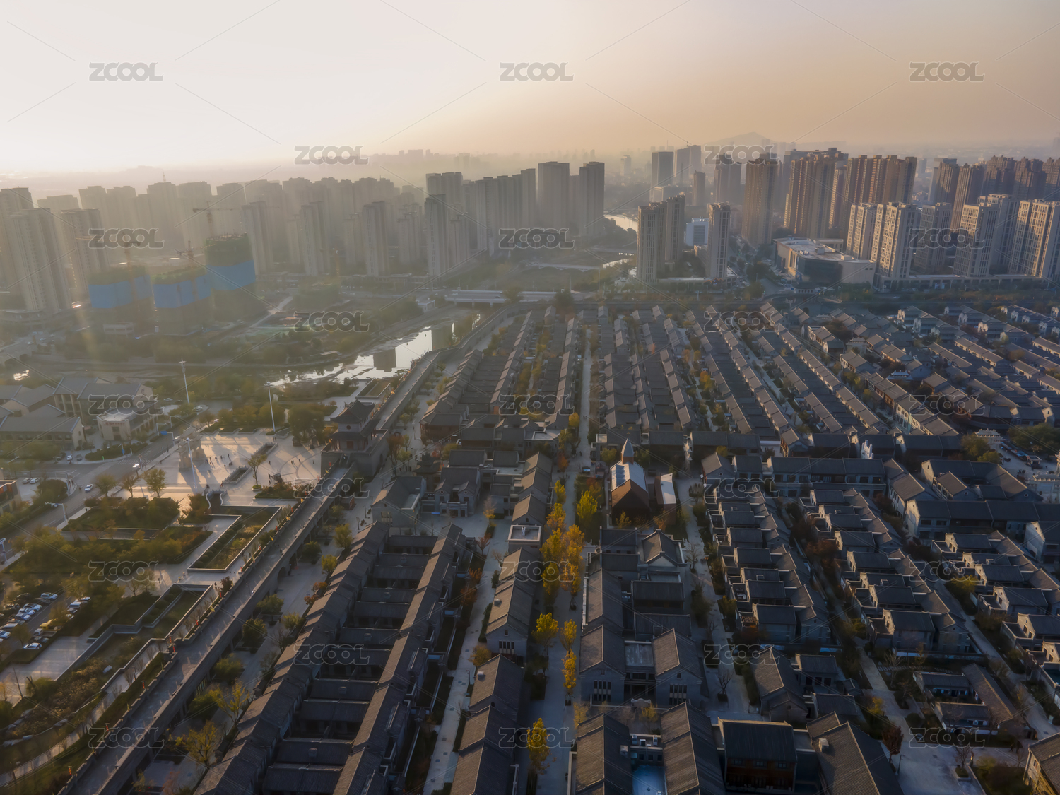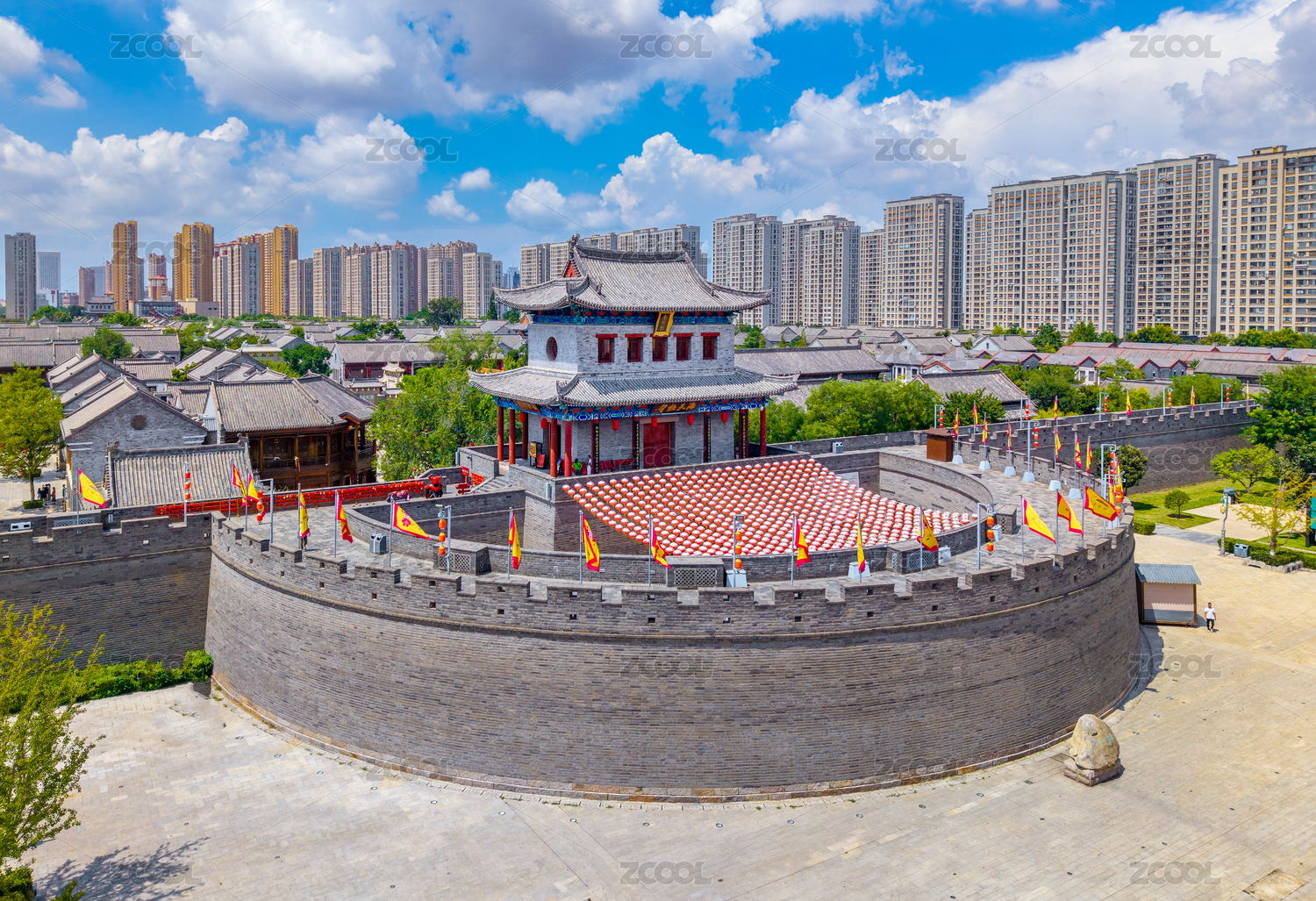 中国山东青岛即墨古城梧桐树叶下的寺庙屋顶