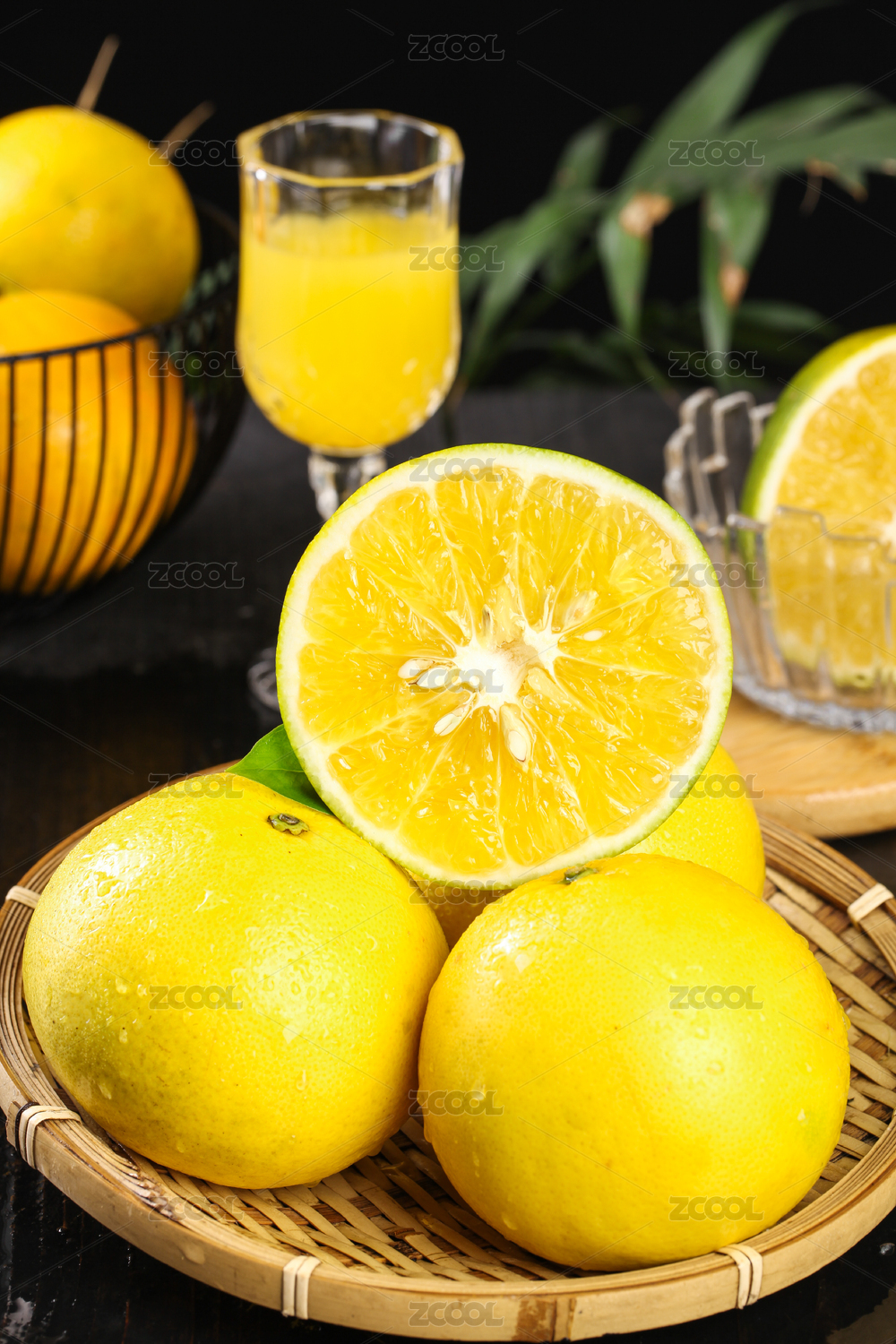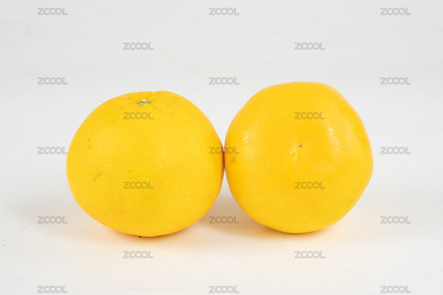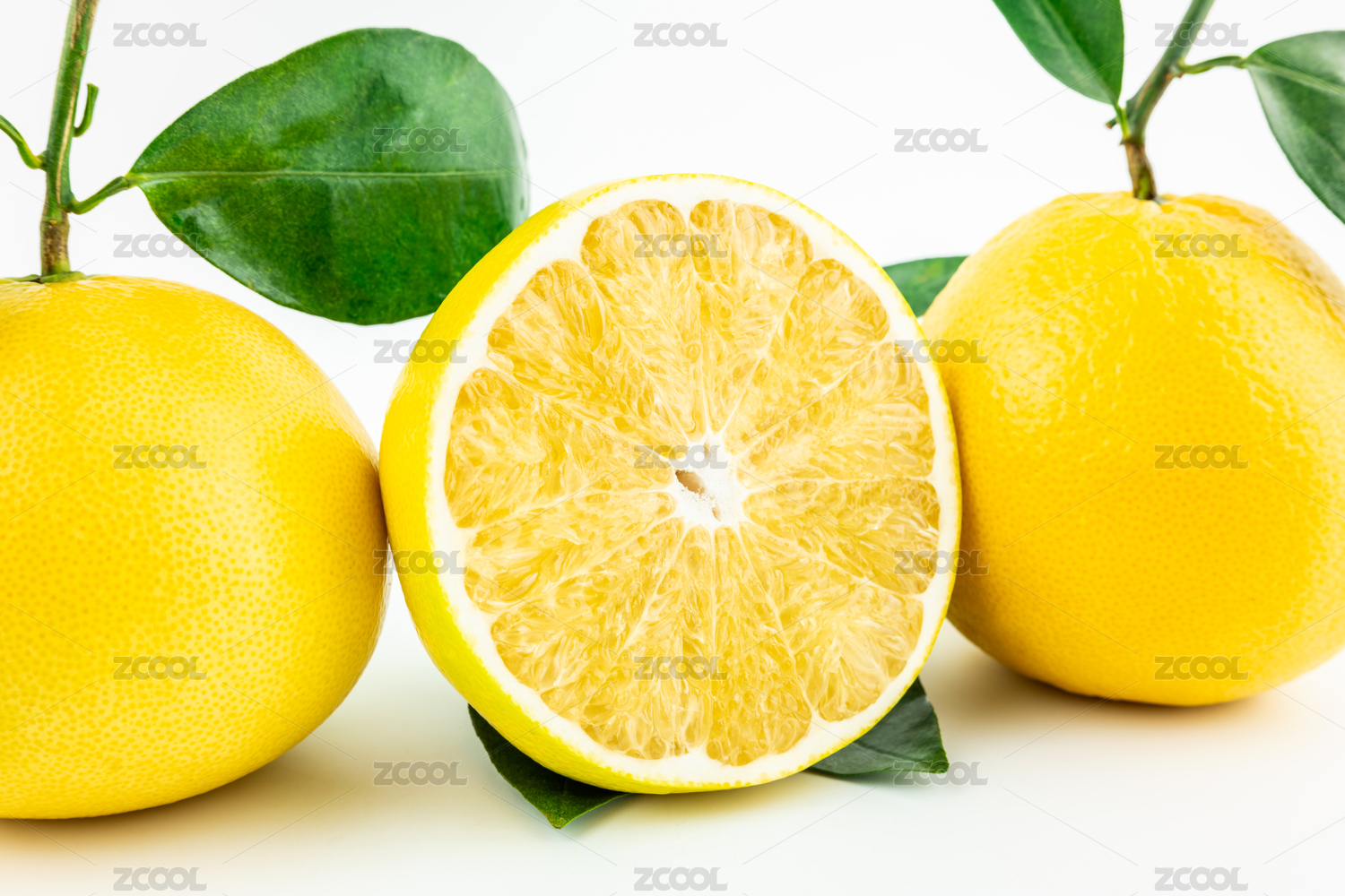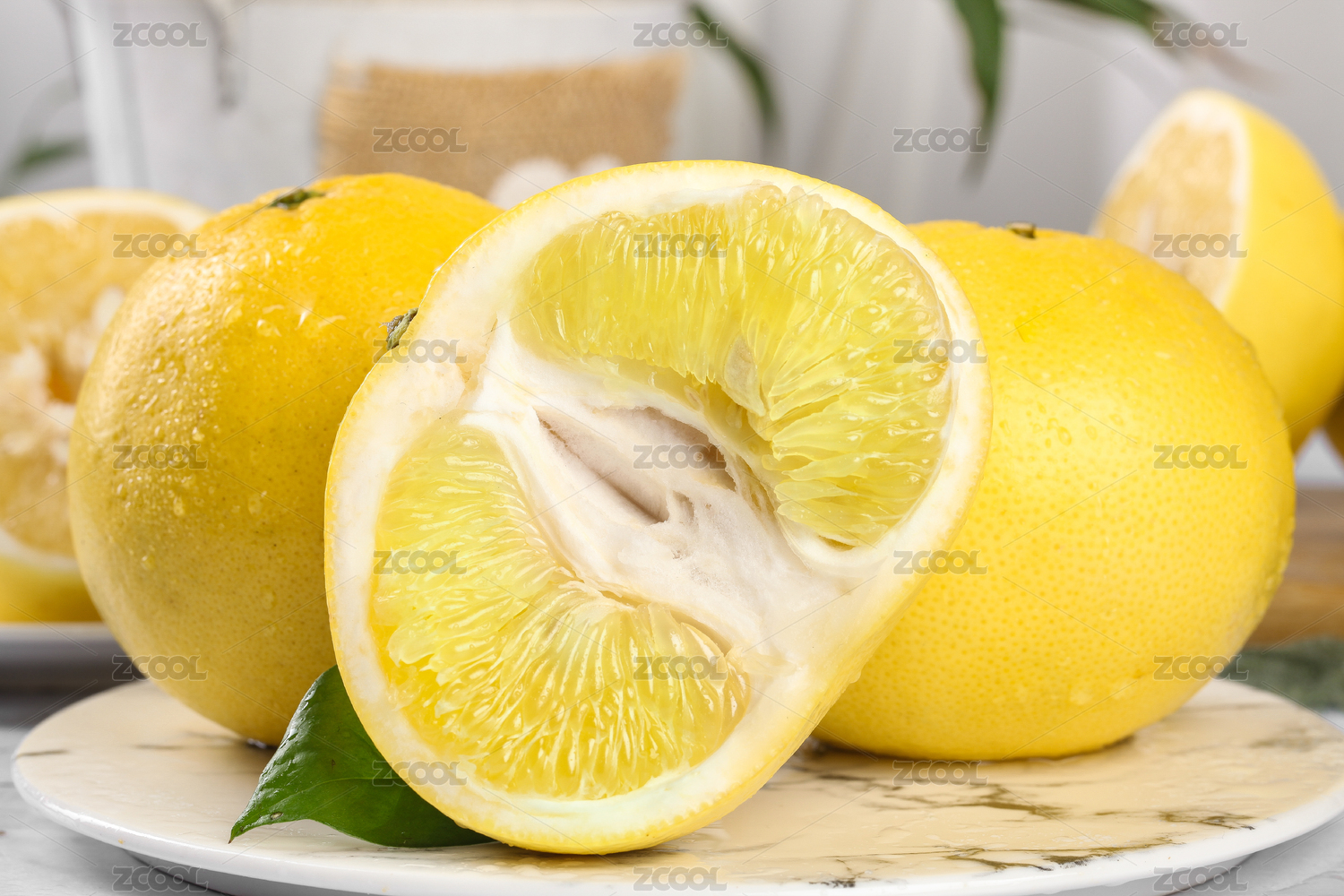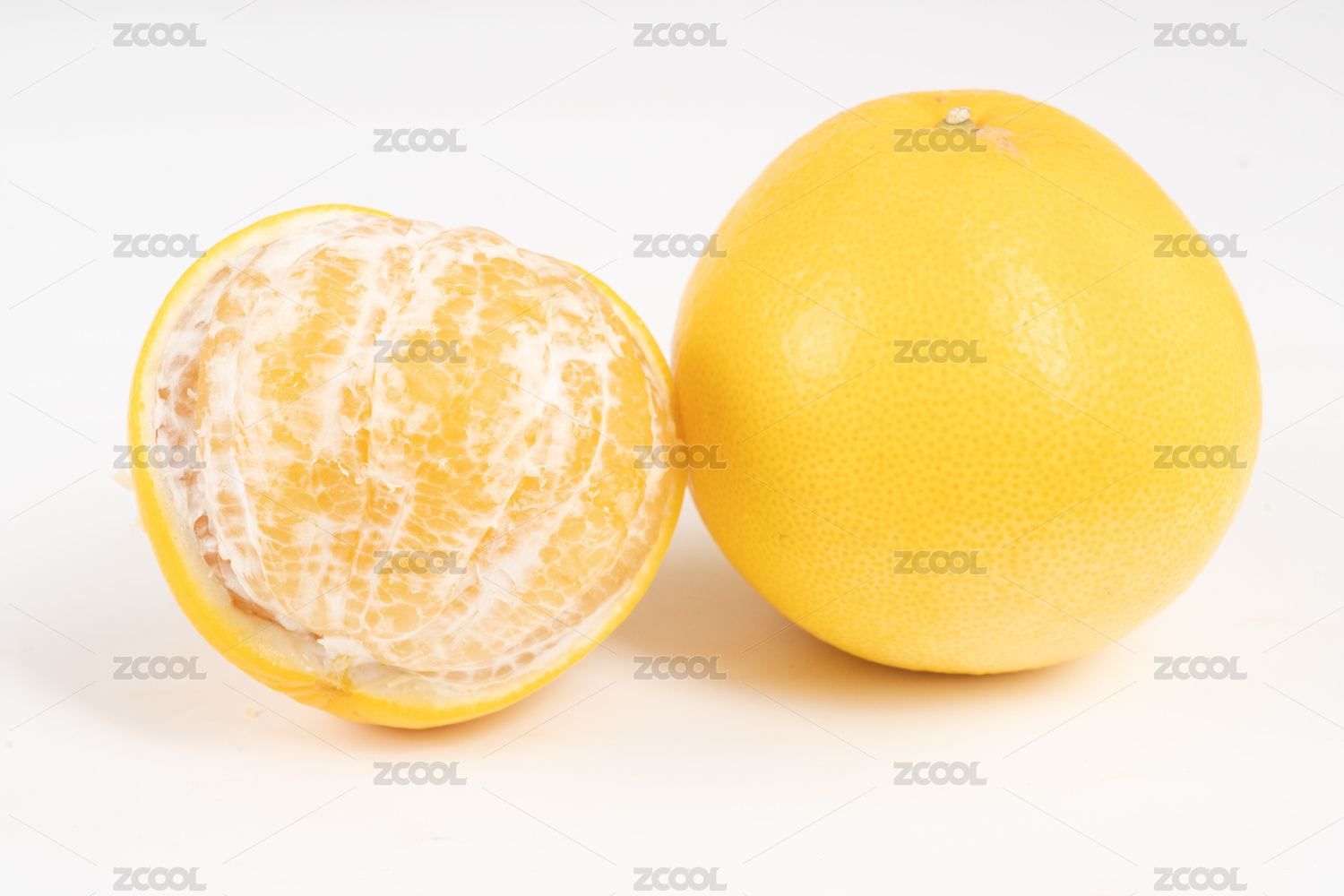 盘子上放着两个黄金葡萄柚和半边葡萄柚果肉