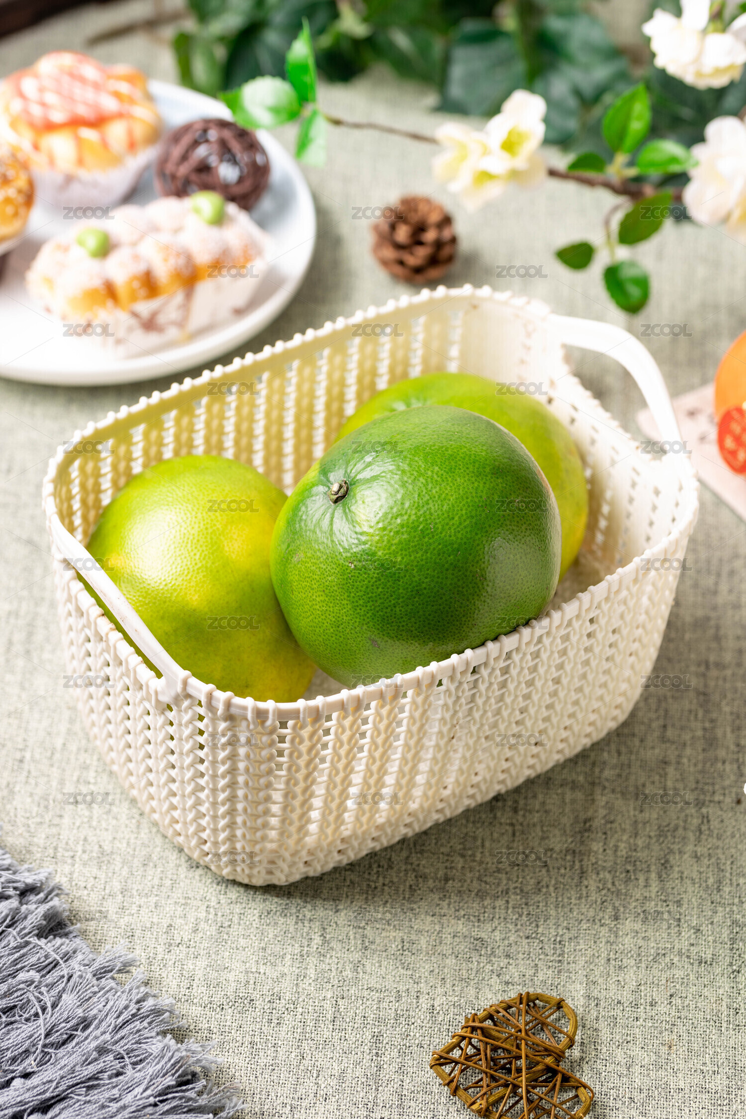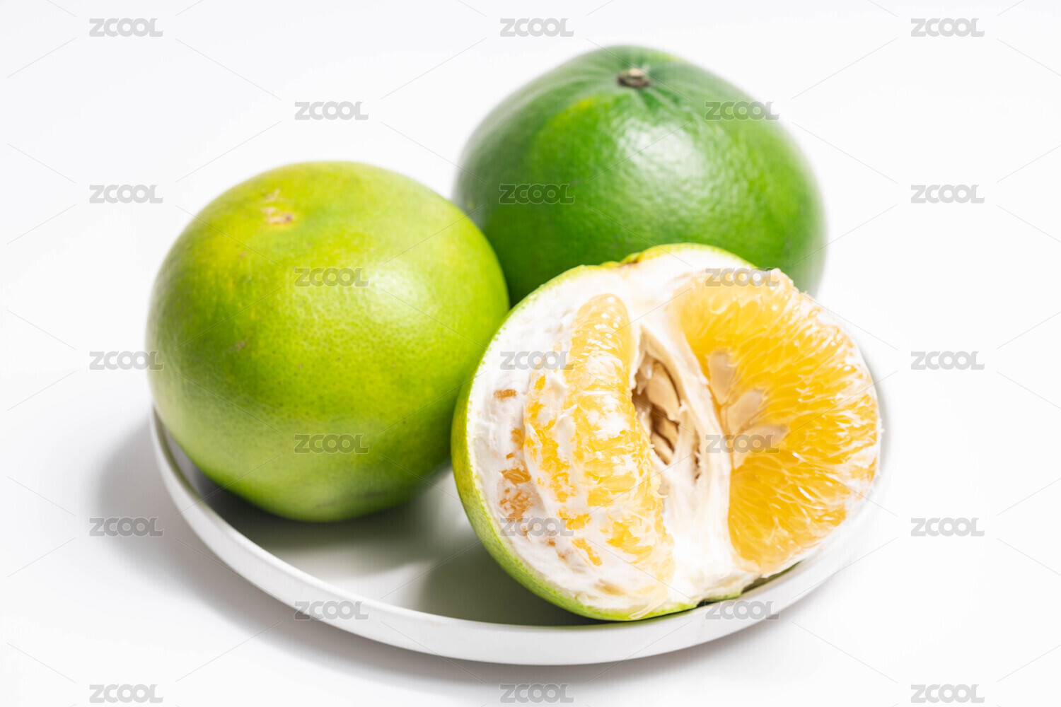 浅蓝底上放着一盘青葡萄柚和切面的西柚