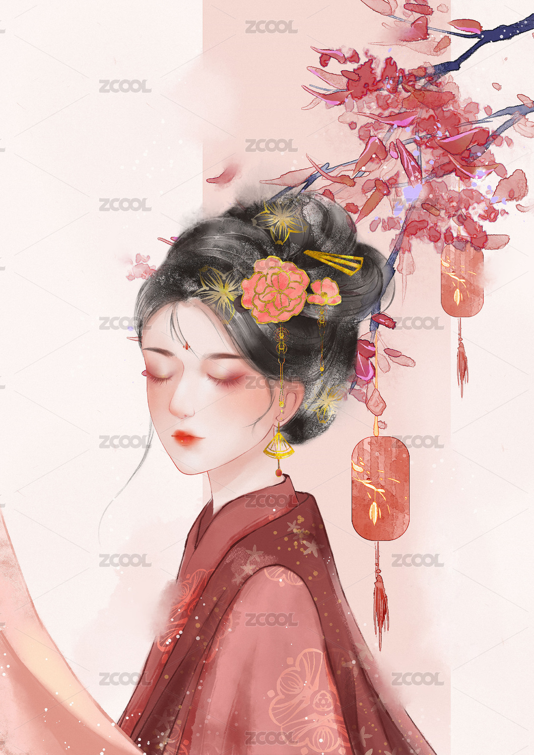 唐朝胖美人贵妃红梅花点唇染唇描边国风插画