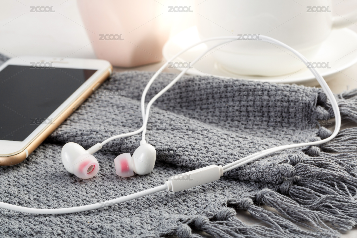 放在围巾上的手机和耳机
