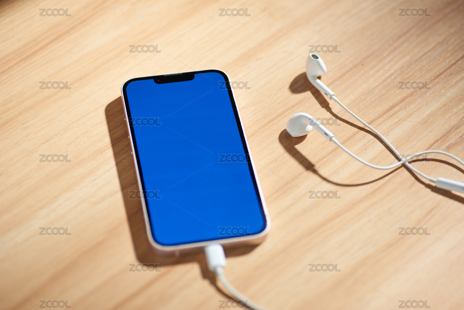 桌面上一台插有耳机的智能手机