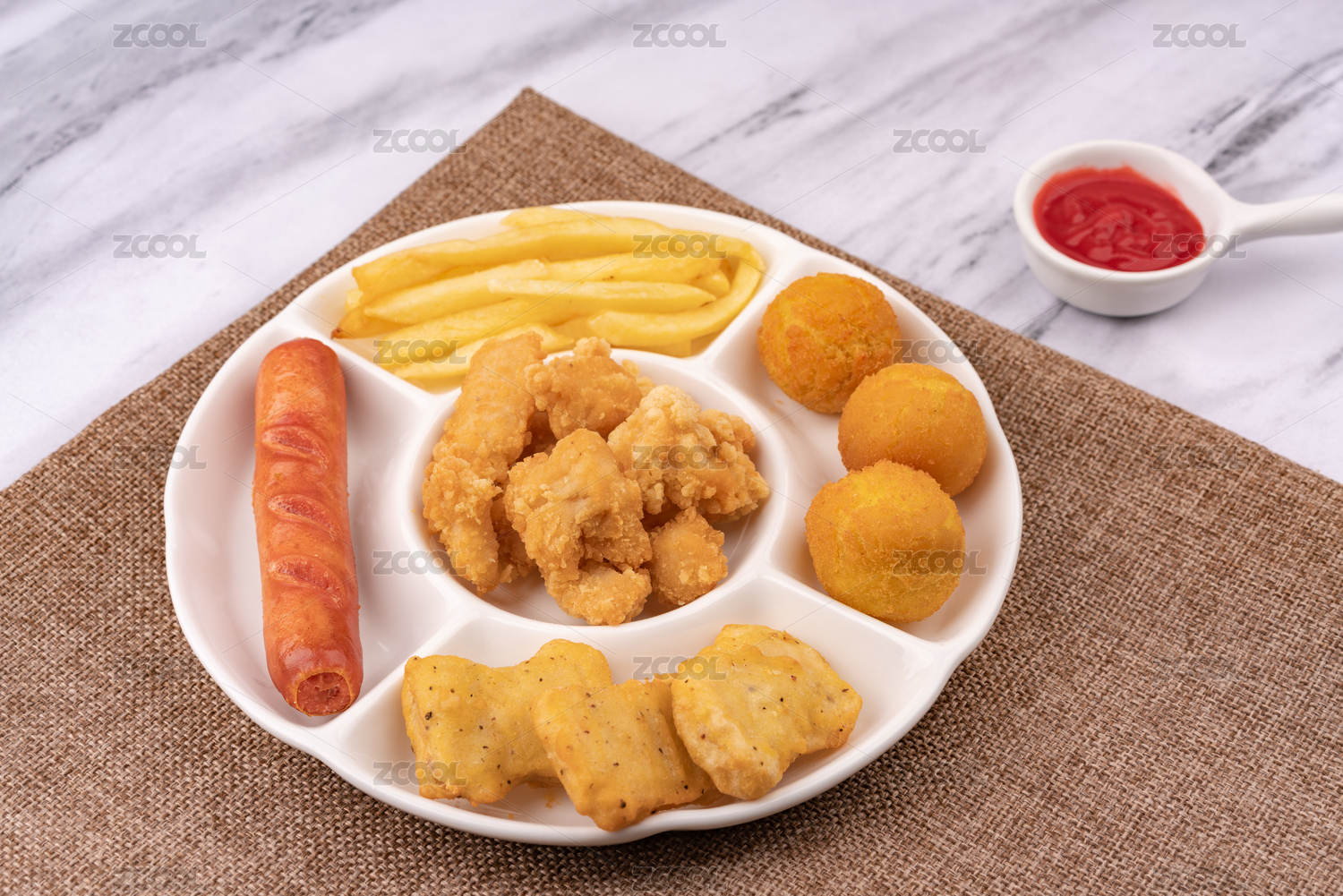 在大理石背景下的油炸的小吃组合,鸡块、番薯丸子、鸡肉粒、薯条