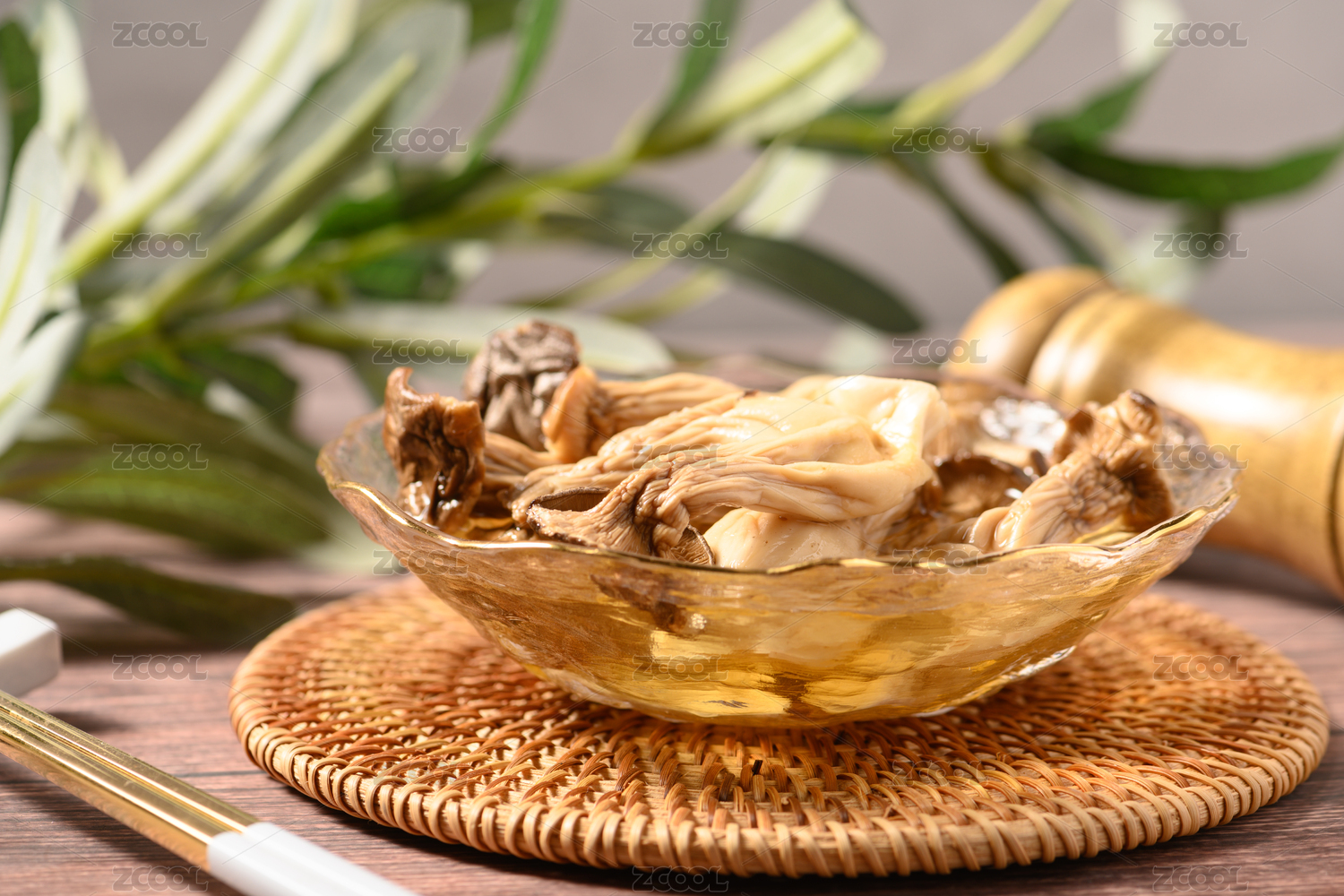 桌面上的玻璃碗里的泡发开的杏鲍菇