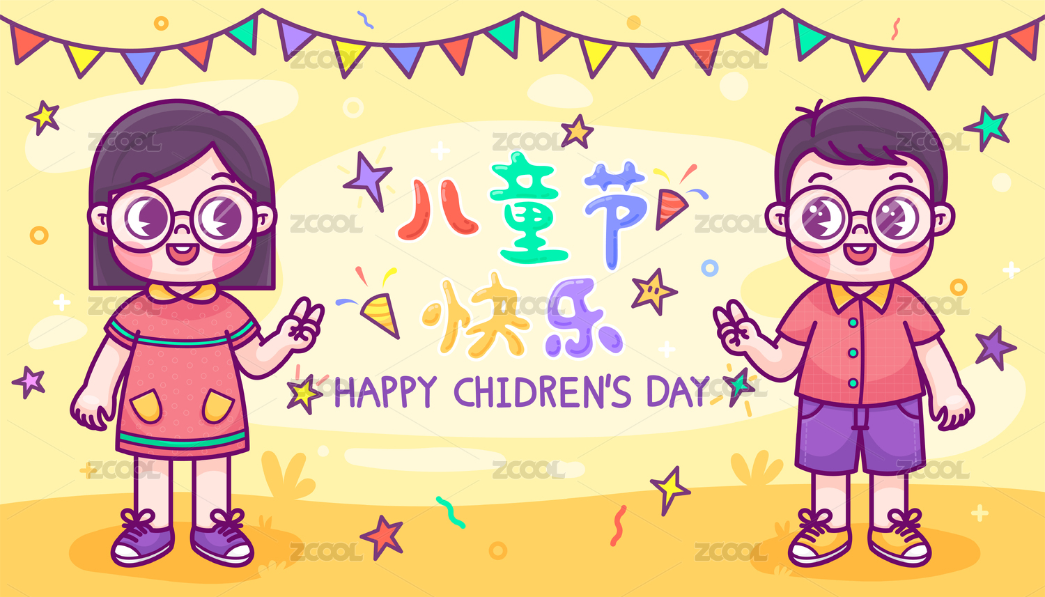 儿童节快乐主题插画 快乐的男孩女孩