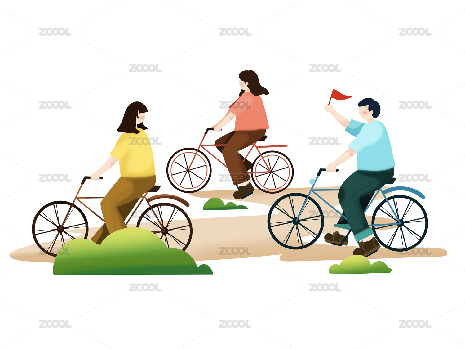 两女一男蓝衣男孩欢呼举三角旗骑行世界骑行日矢量骑自行的人多人