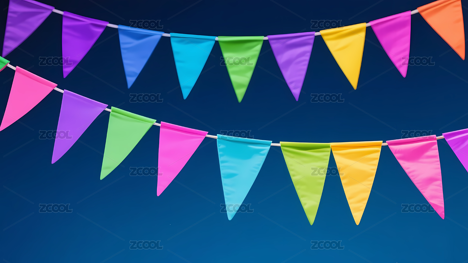 彩色三角旗飘扬在蓝天