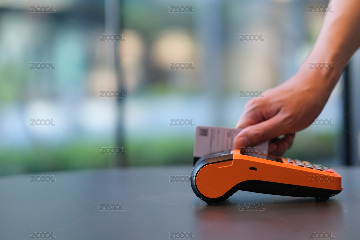 在POS机上刷信用卡的动作特写