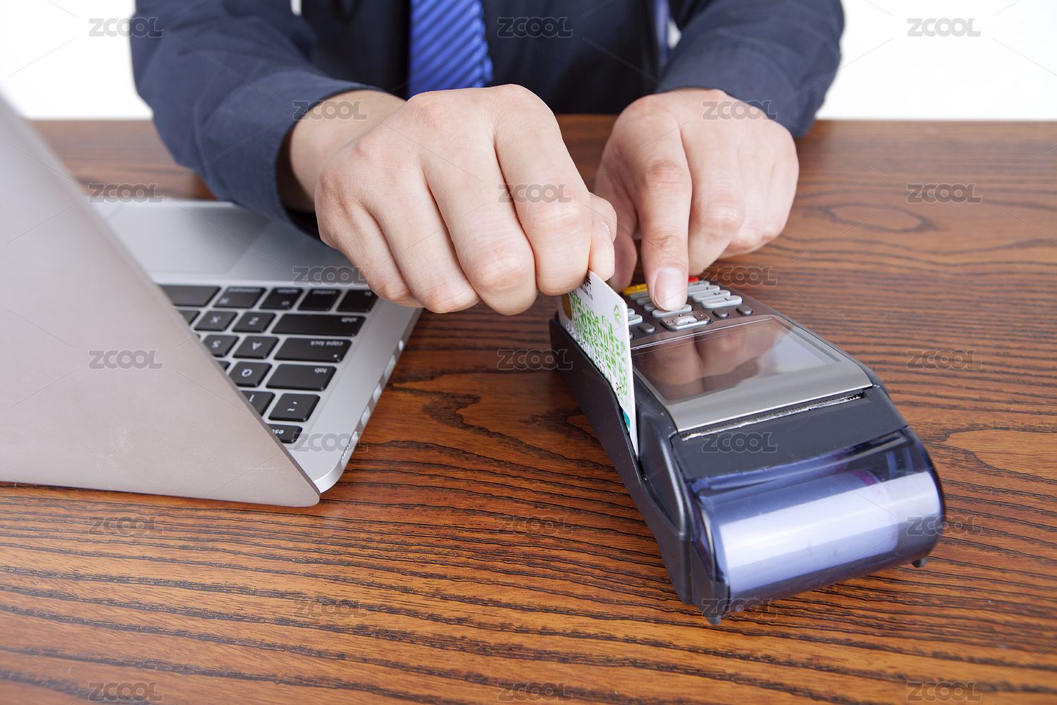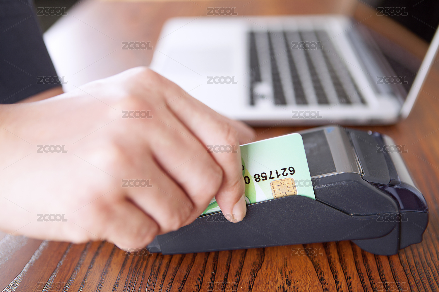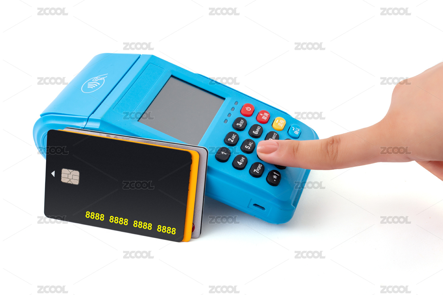 手拿着信用卡在POS机上刷卡的动作特写