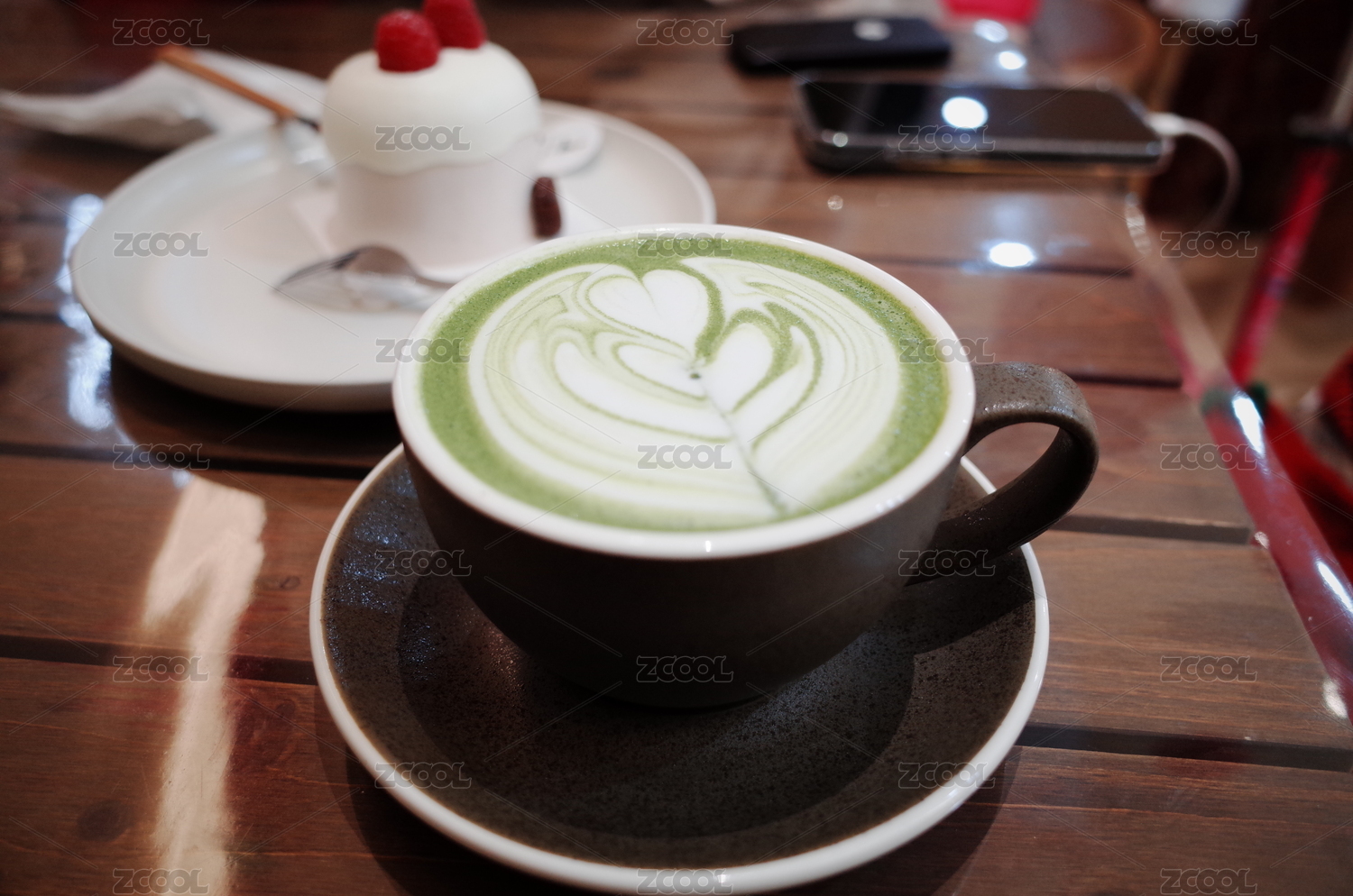 浅色木纹桌上有一杯抹茶拿铁和一块巧克力蛋