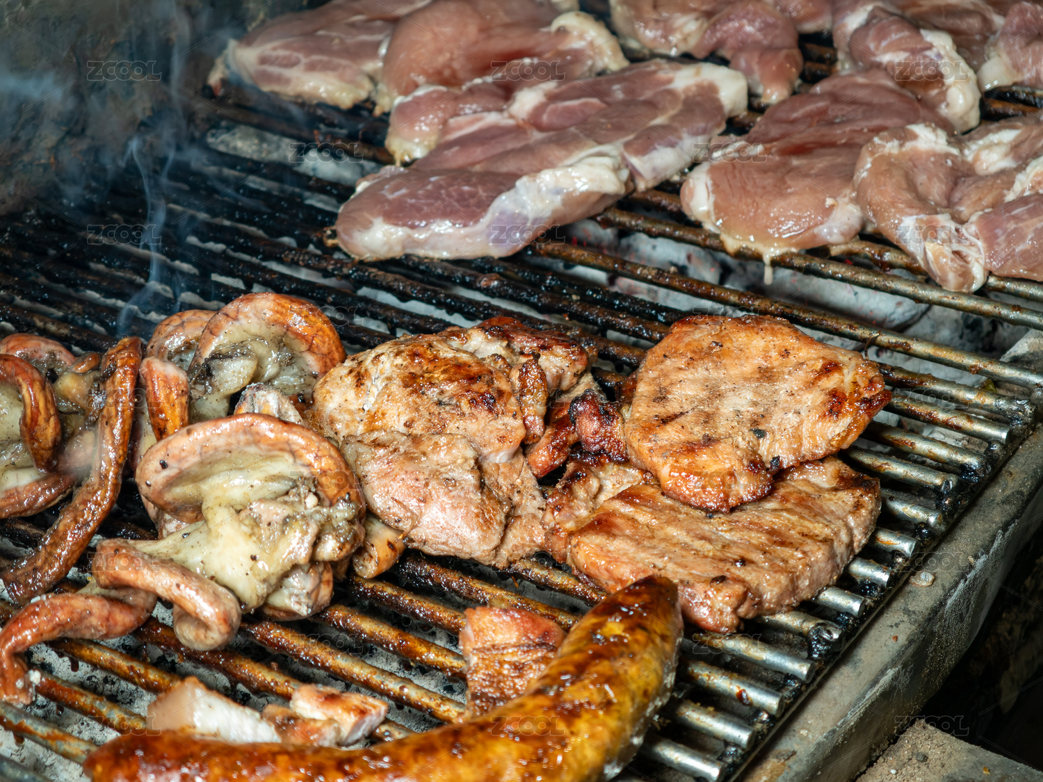 炭火烤制各种肉类和香肠的泰式街头烧烤
