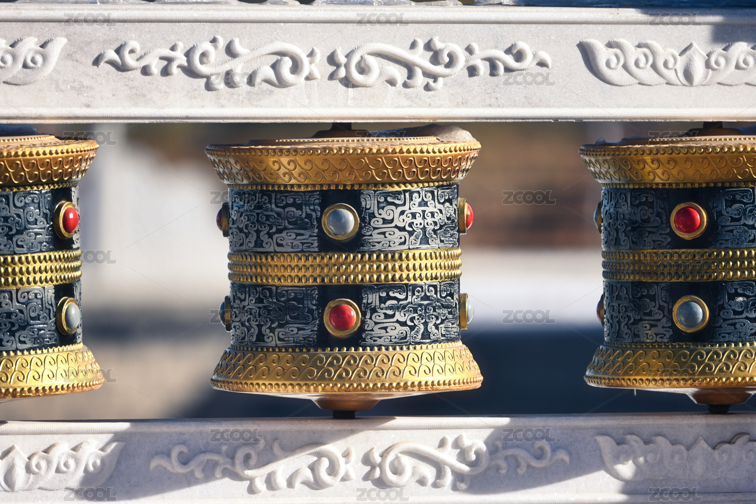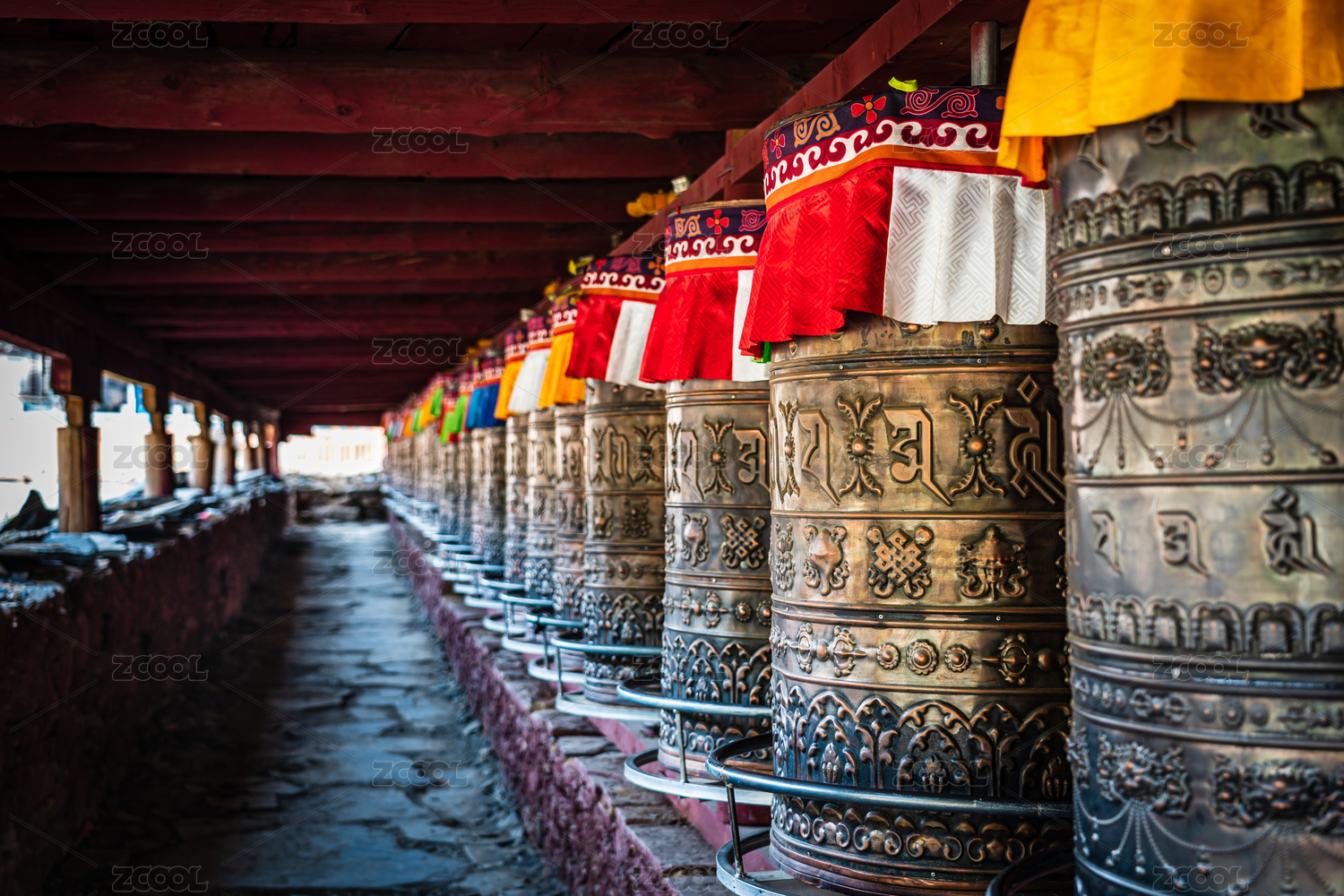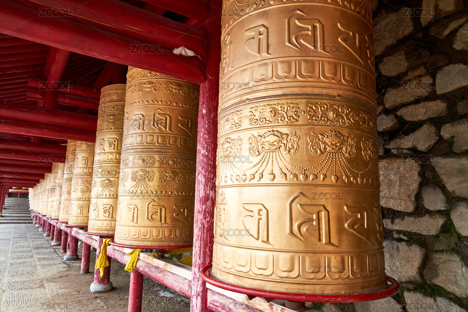 四川甘孜州稻城县著杰寺内排列整齐的转经筒