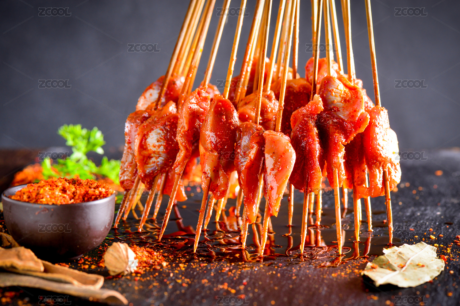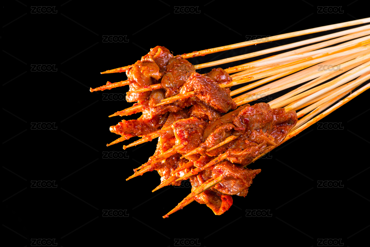 黑色背景中的麻辣小郡肝串串