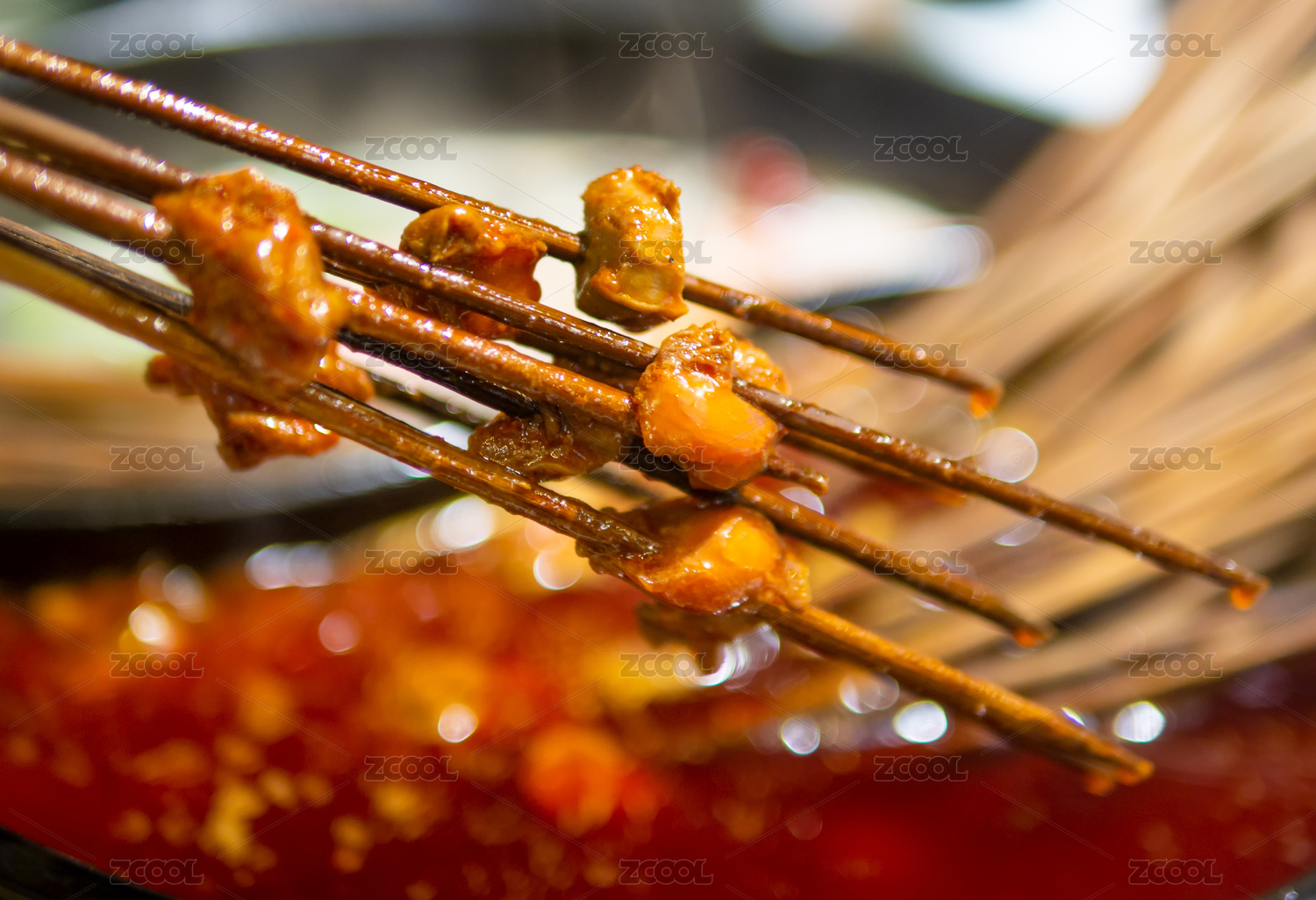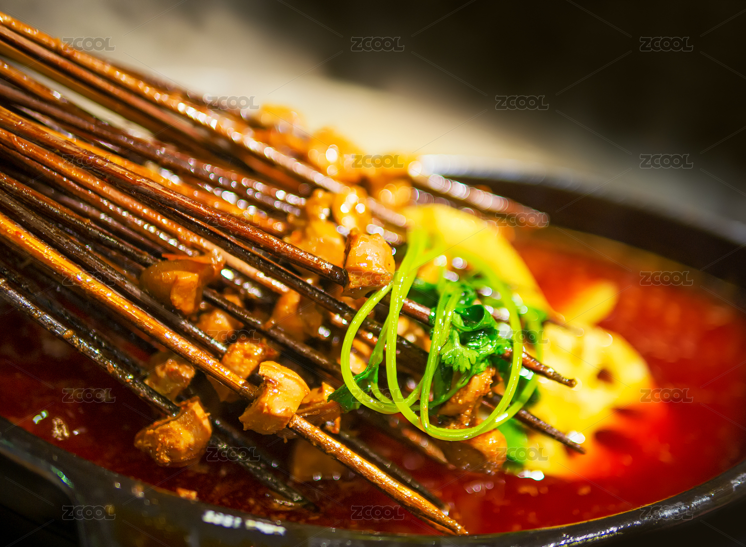 竹签上穿的中国特色美食四川小郡肝串串香特写