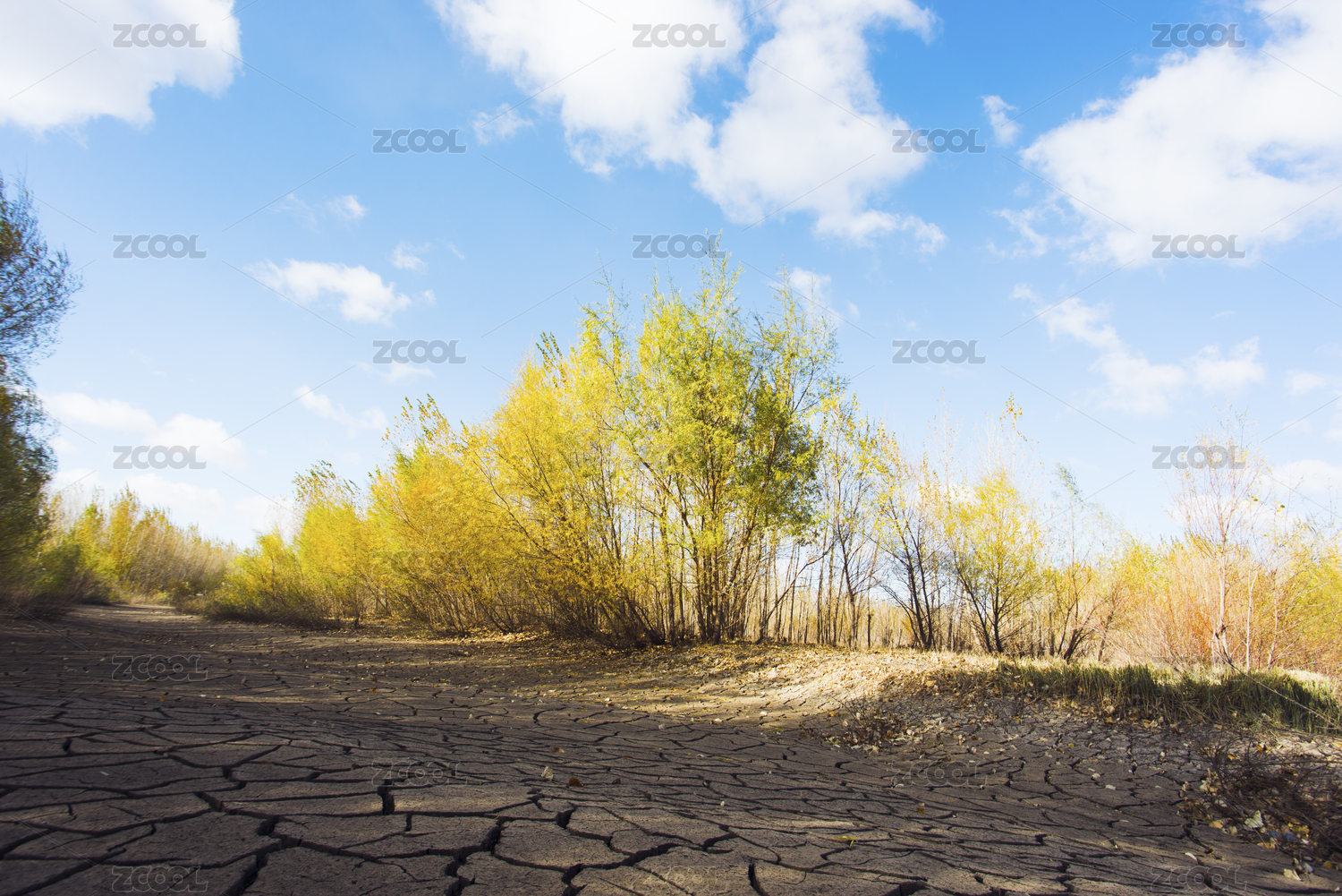 秋天干裂的河道和岸边的树木