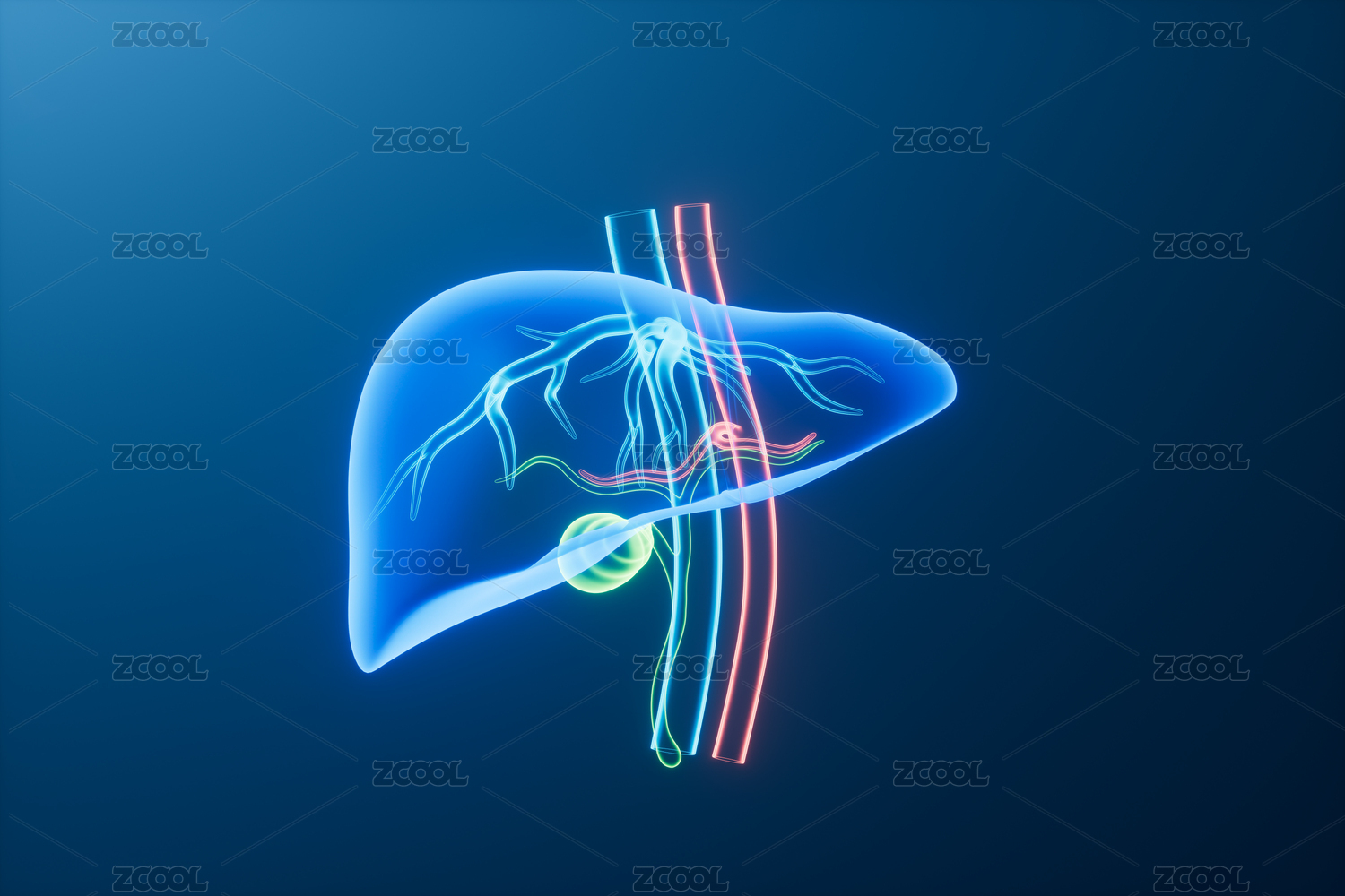 3D渲染的蓝色背景下的发光医疗肝脏器官