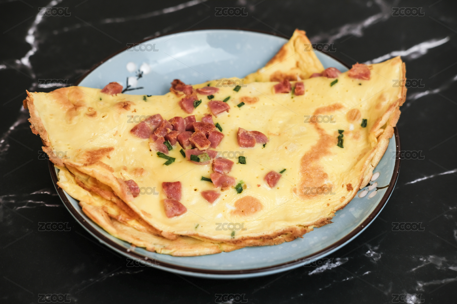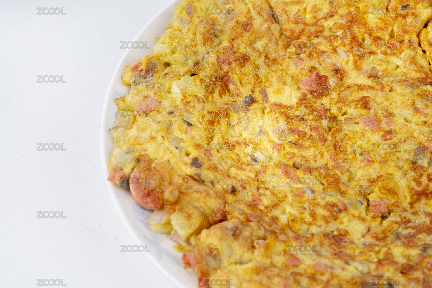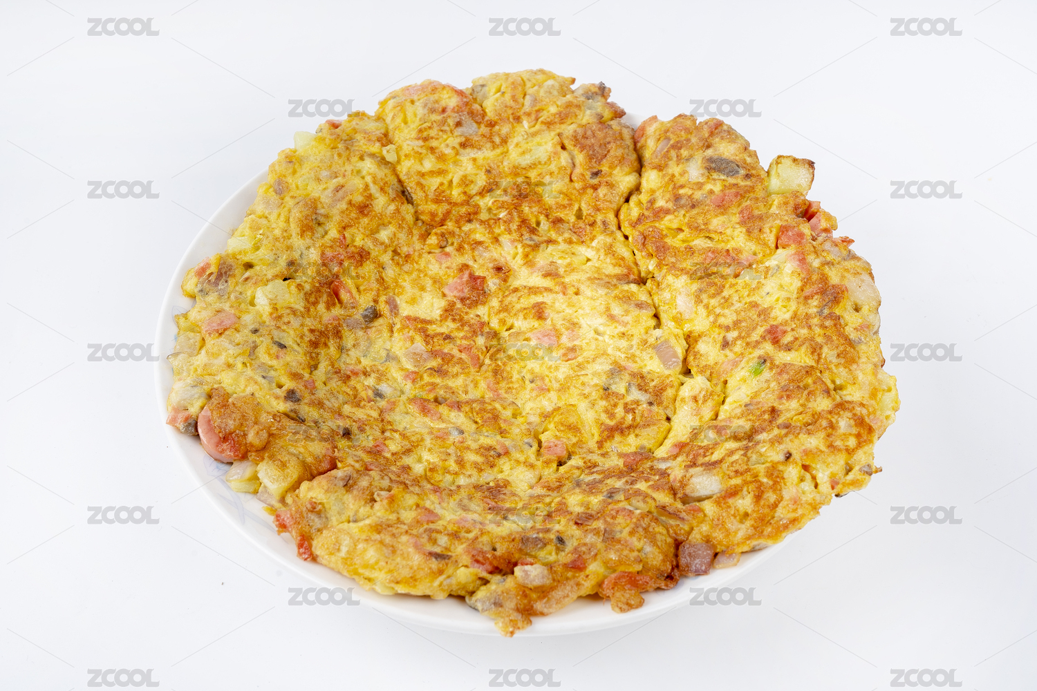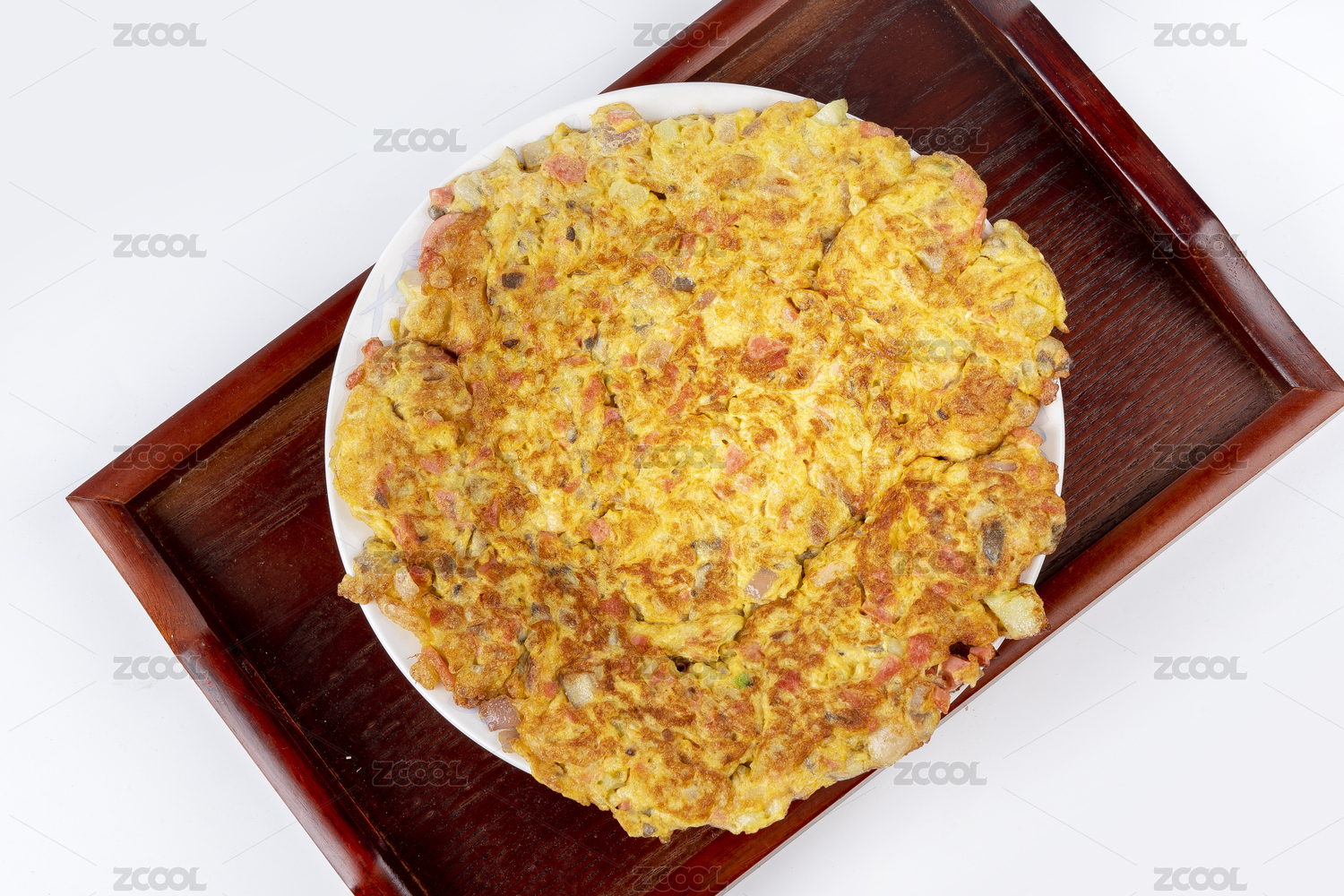 白色背景上一盘槐花瘦肉鸡蛋饼
