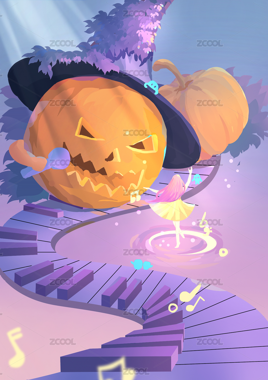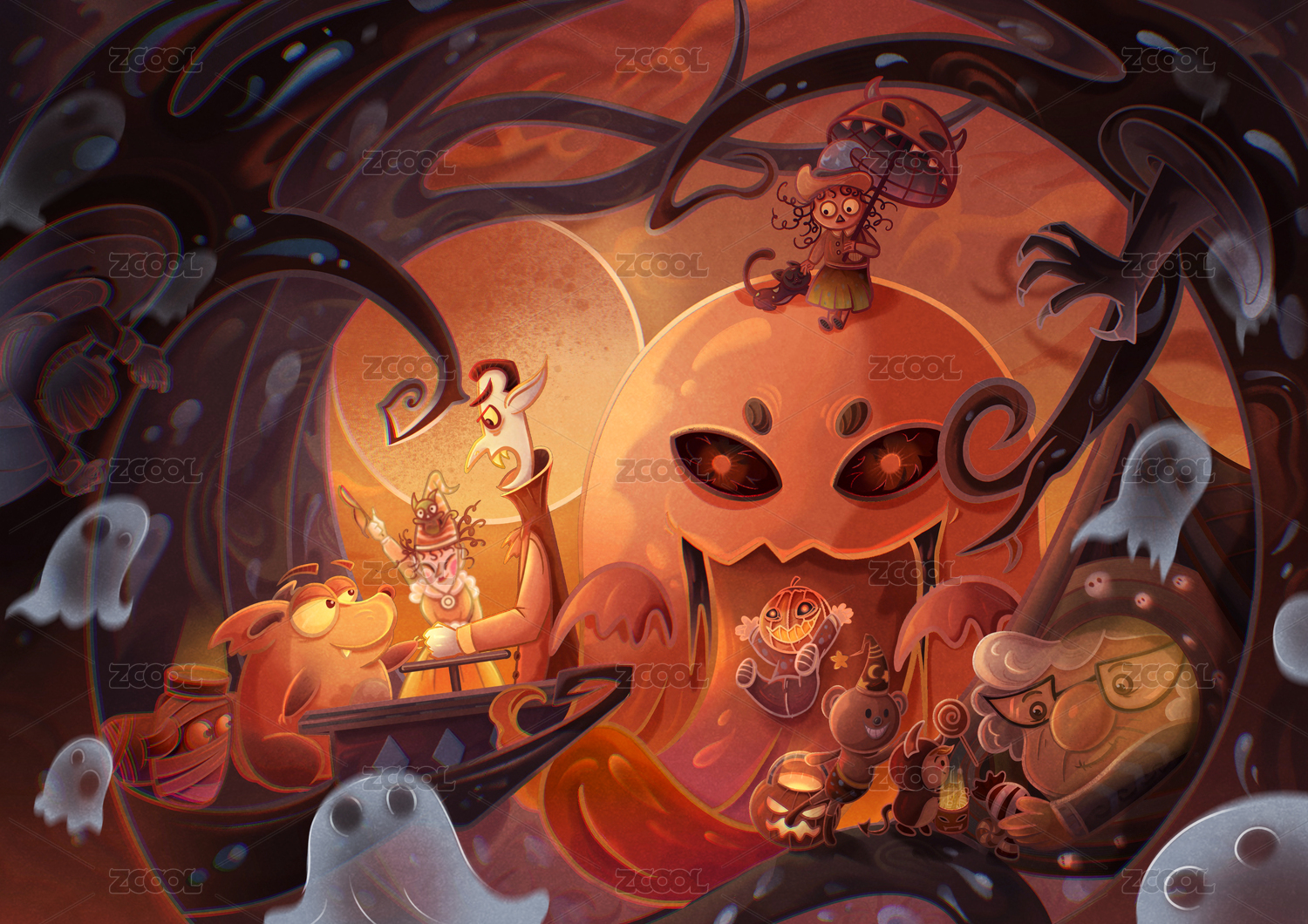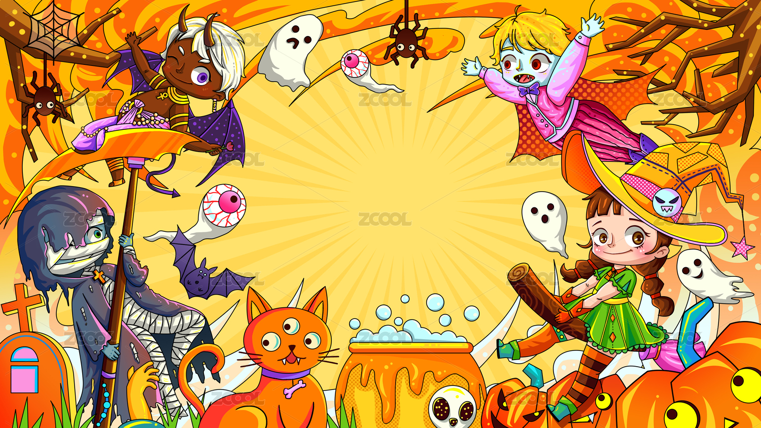 卡通手绘万圣节鬼怪巫婆闪屏插画背景