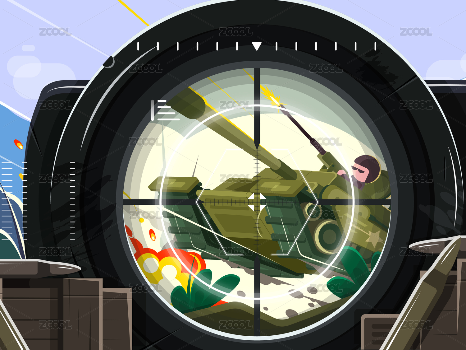 战场上瞄准镜对准坦克的插画设计