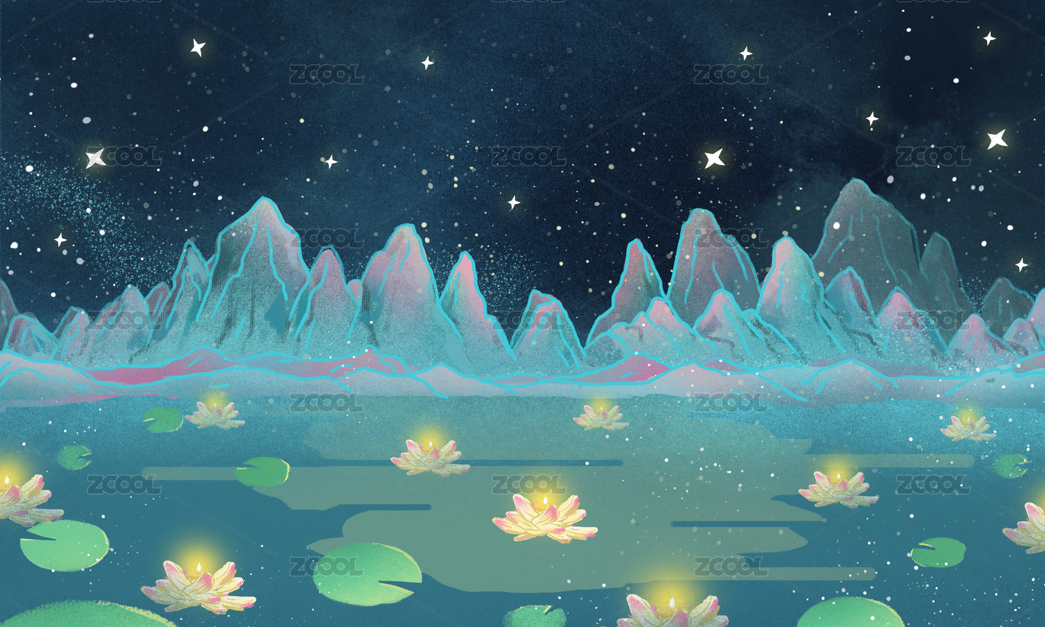 粉黄蓝国风寒衣节唯美河灯场景