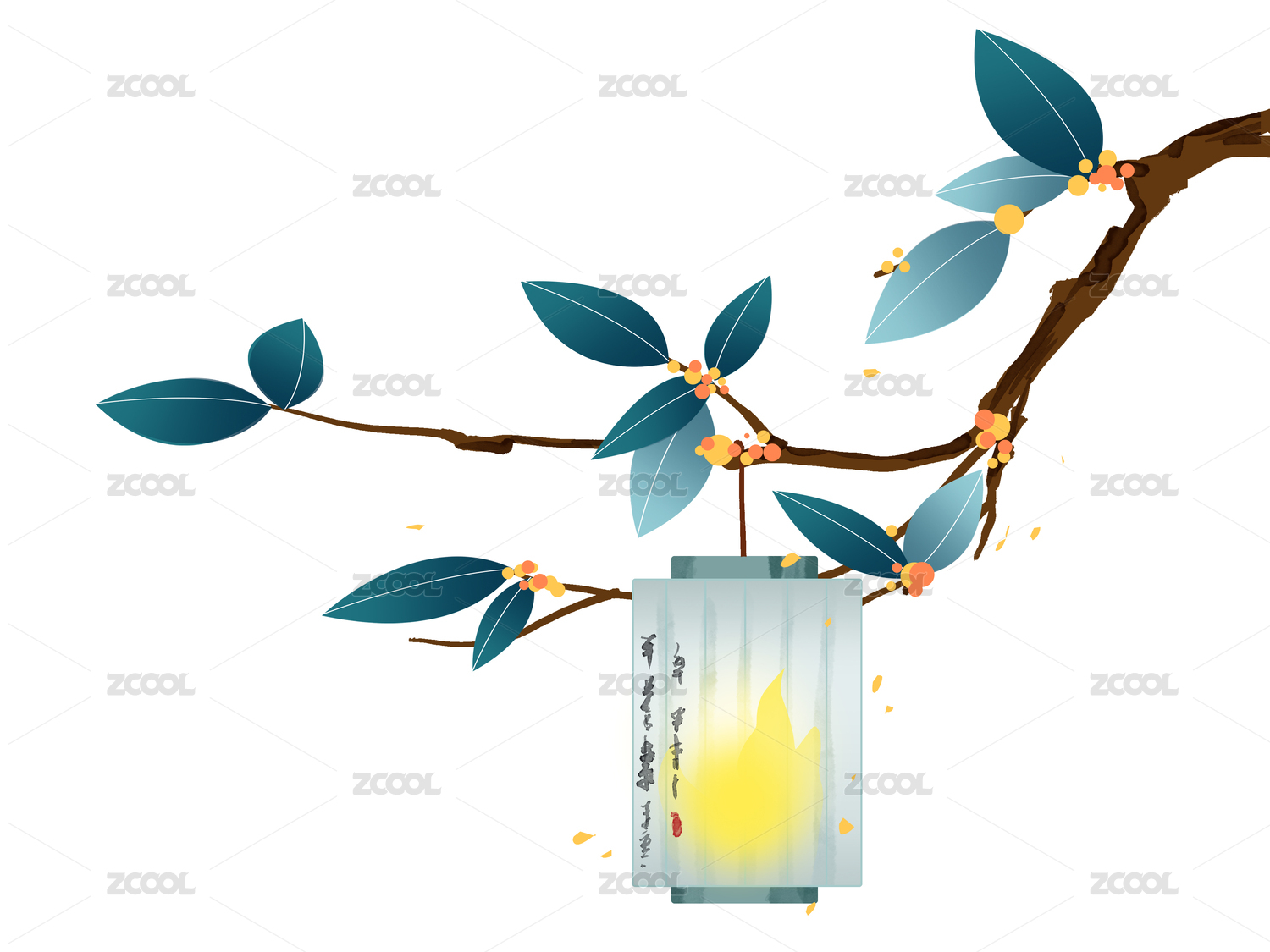 绿蓝国风寒衣节白色灯笼和树枝树叶