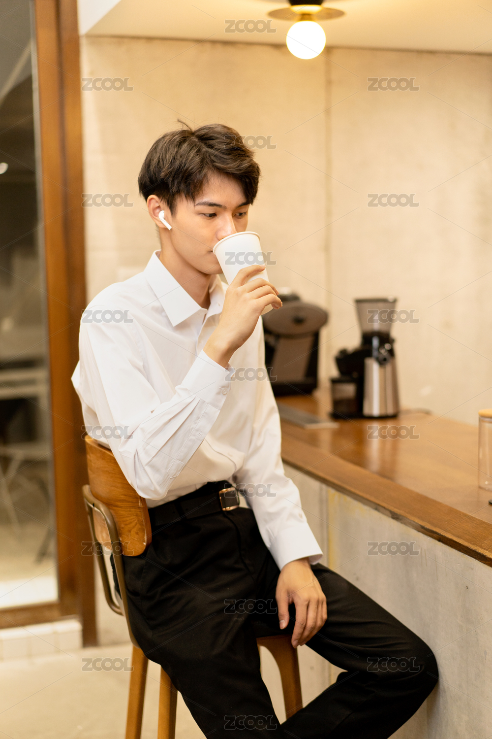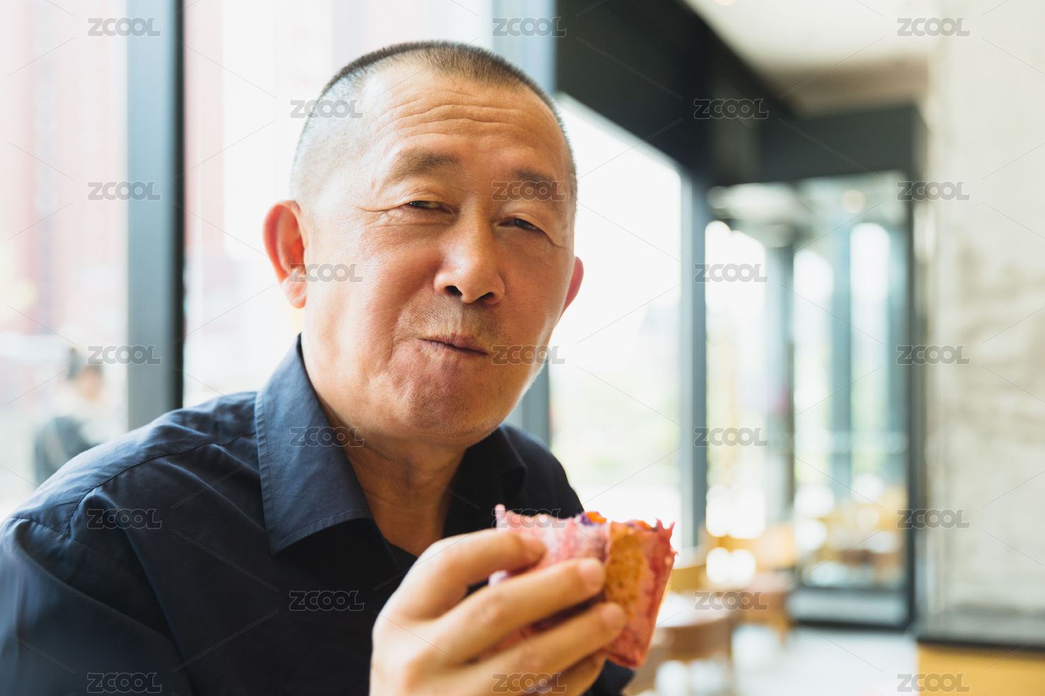 坐在咖啡馆吃美食的亚裔男人看向镜头