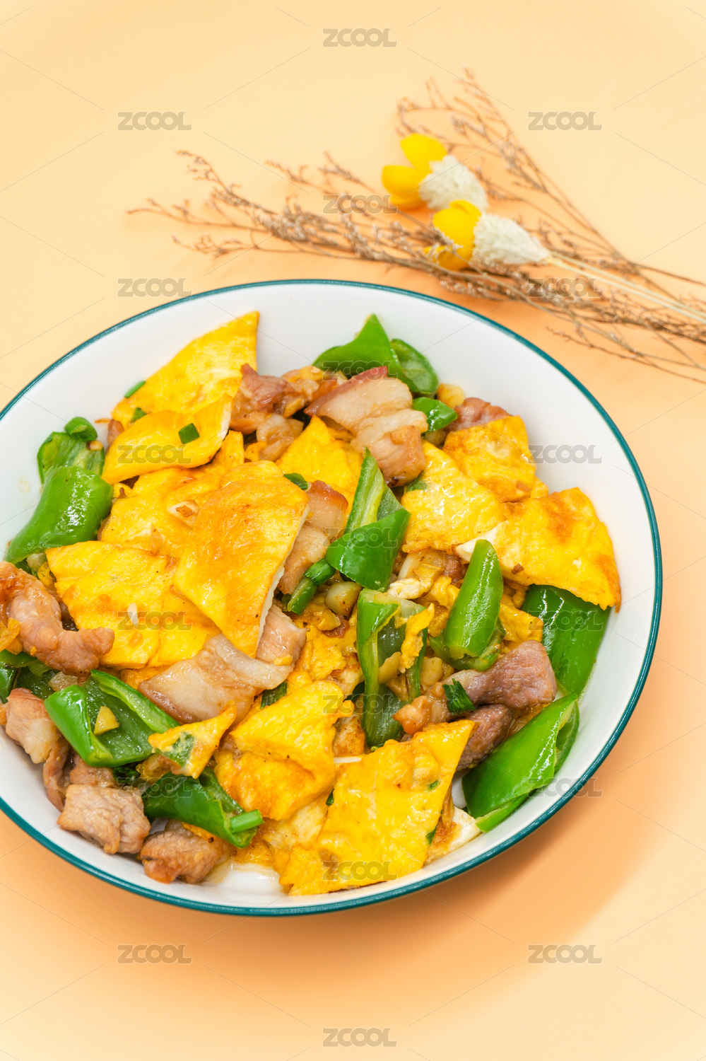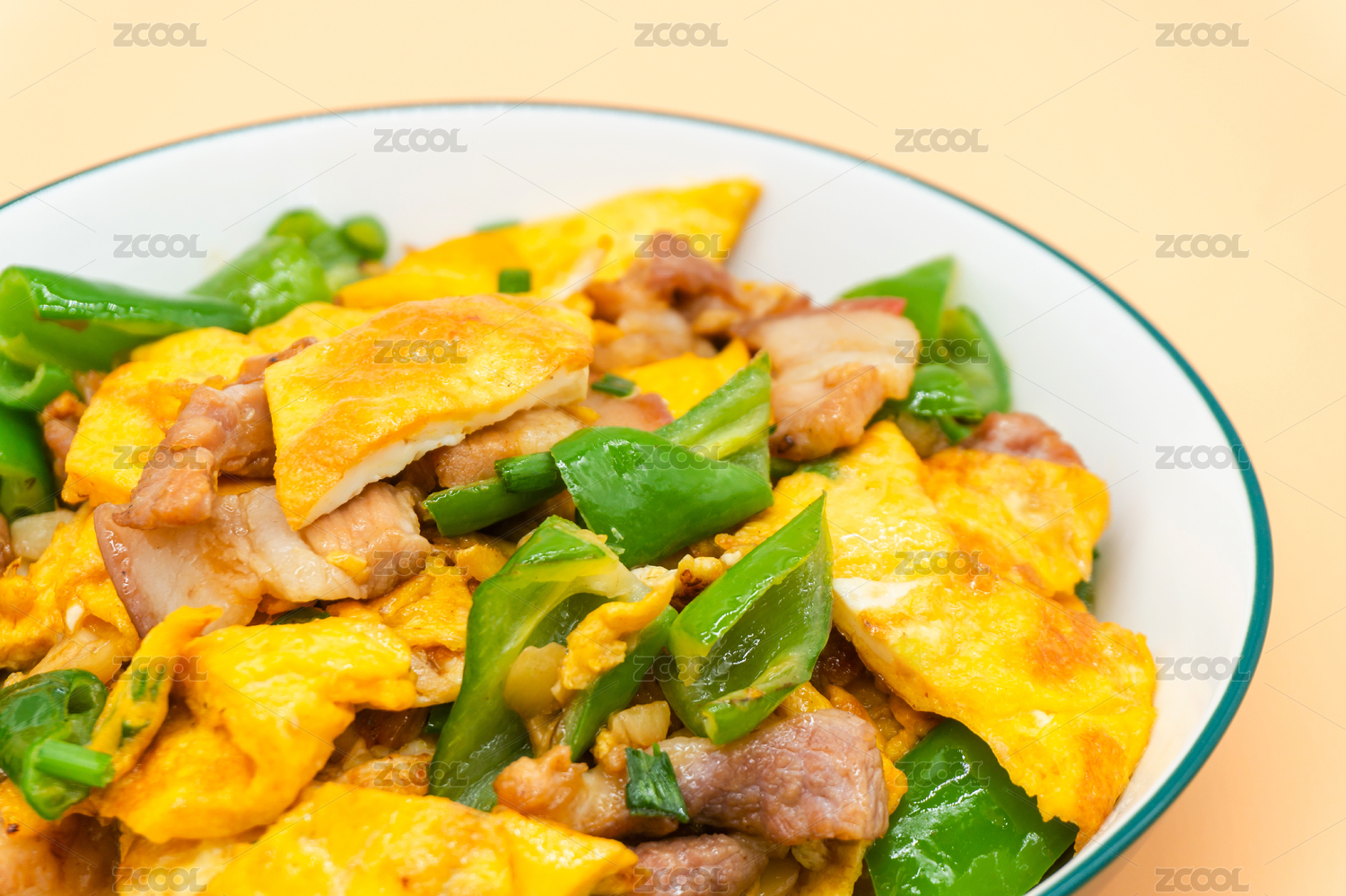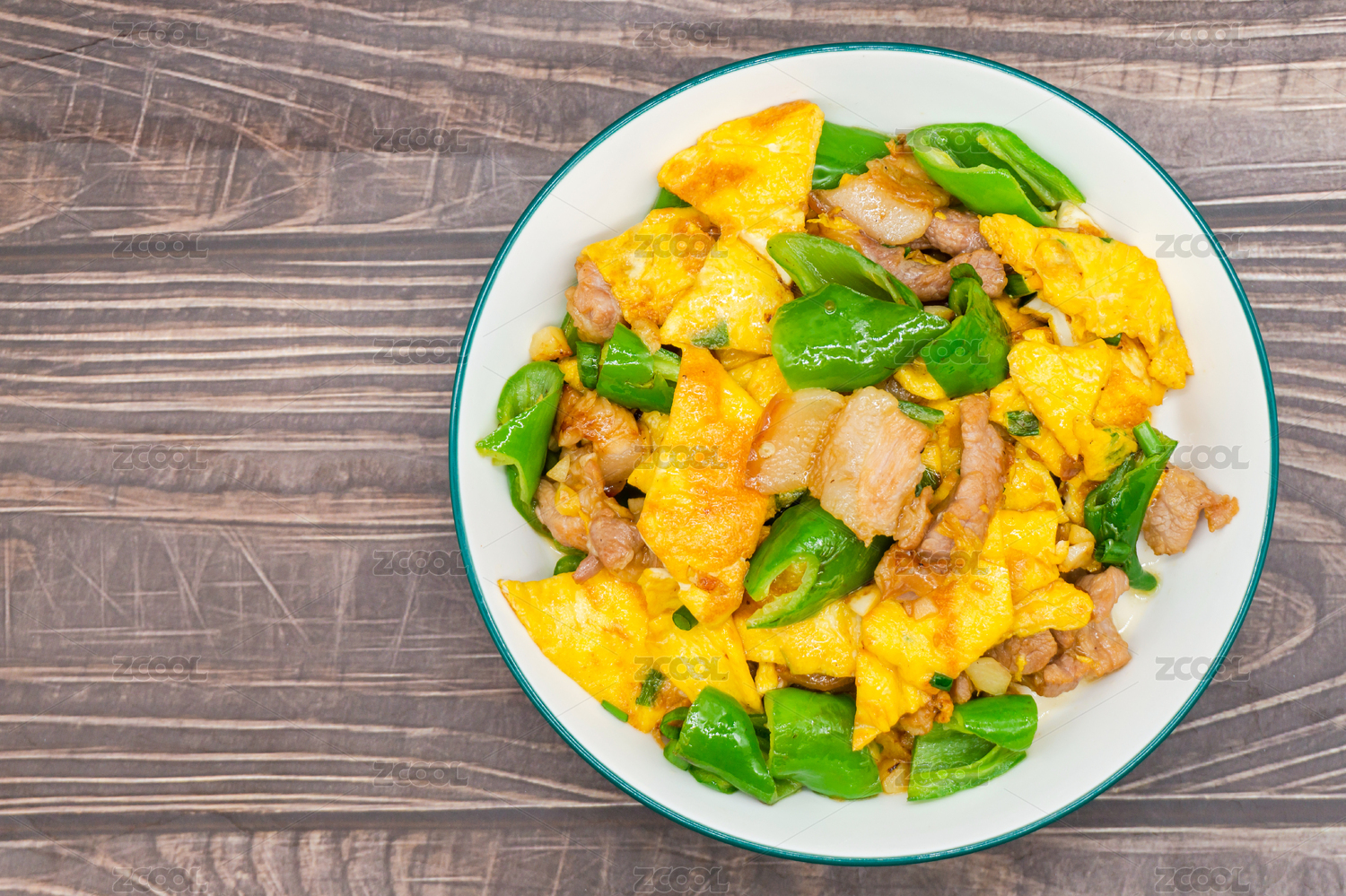 装在白色大碗里面的农家一碗香辣椒鸡蛋炒肉