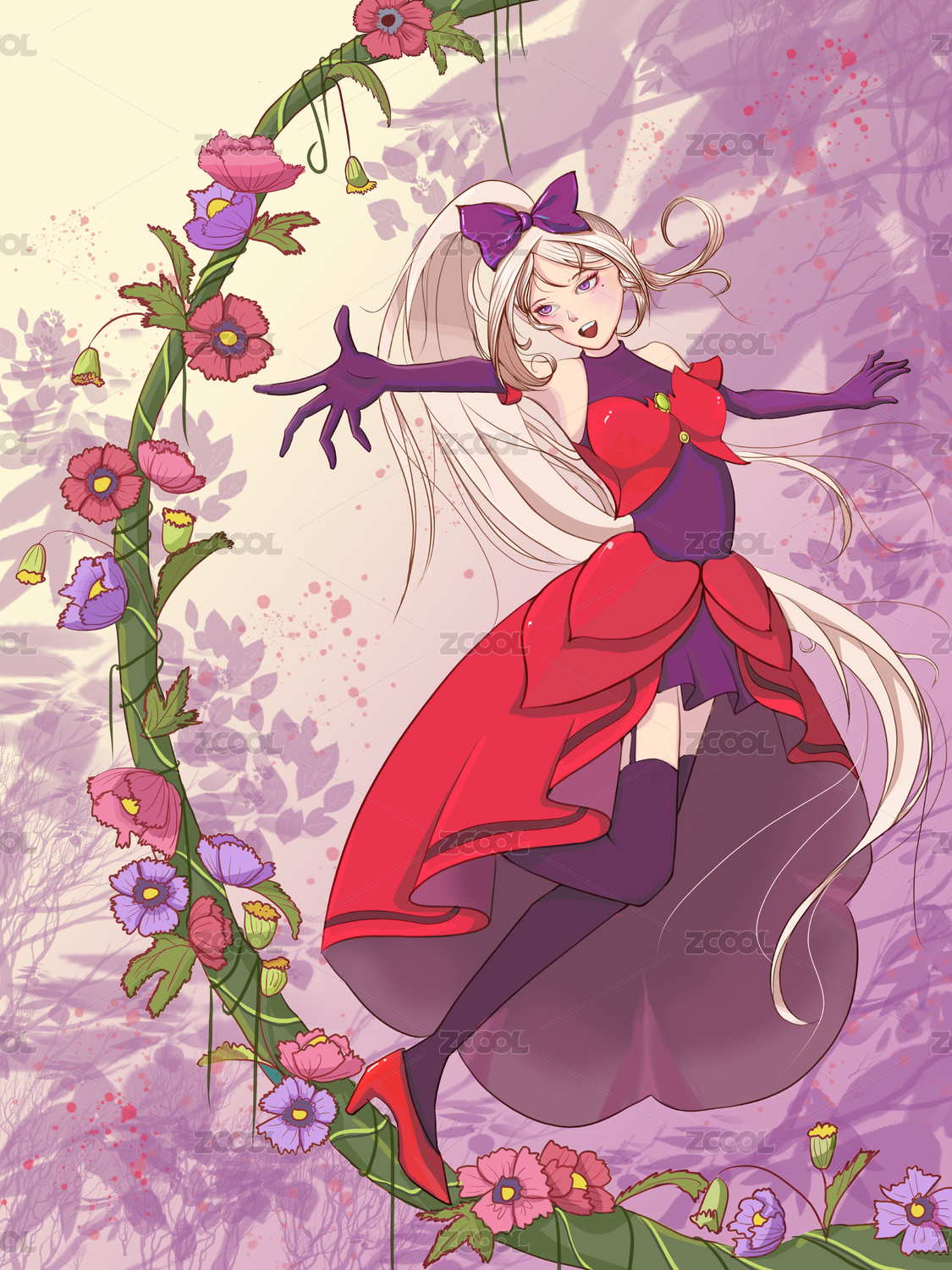踩在花藤上身着紫红色裙子的少女伸展开手臂