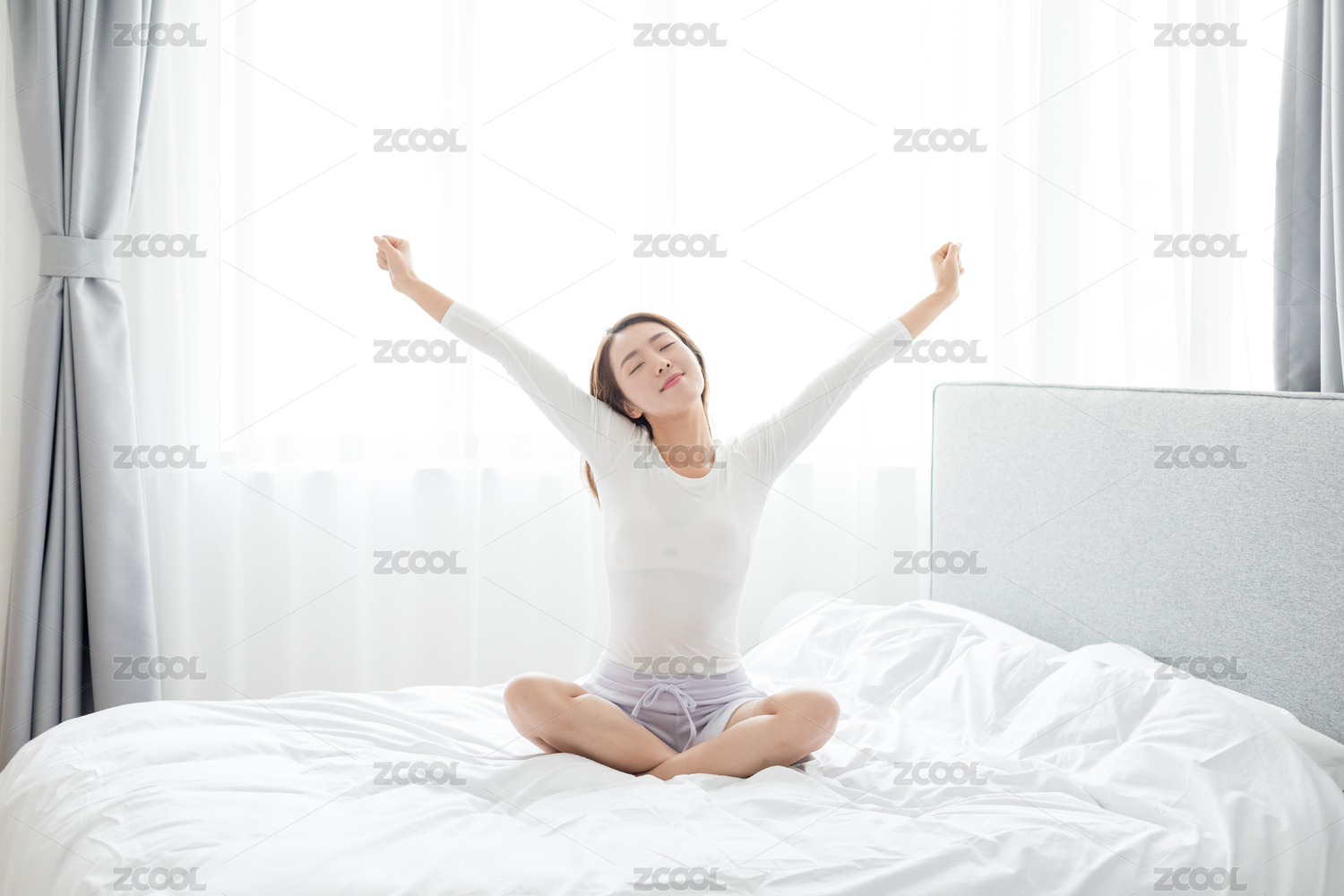 年轻女性早晨睡醒盘腿坐在床上双臂伸展开拉伸身体