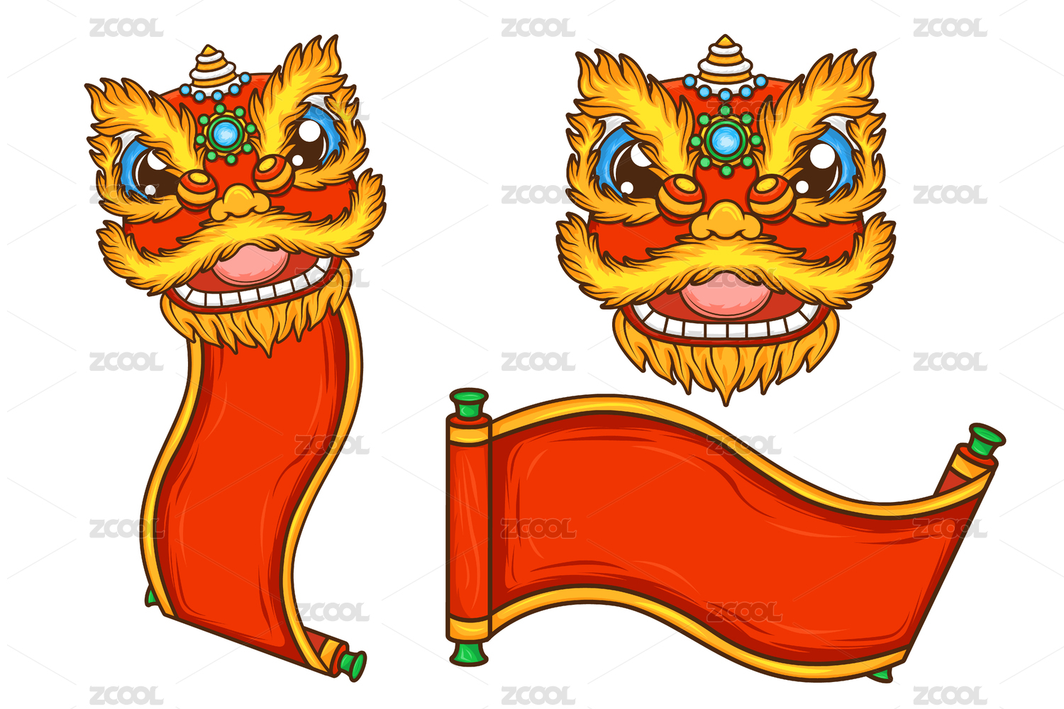 矢量国潮醒狮金币横幅展开卷轴标题文本框