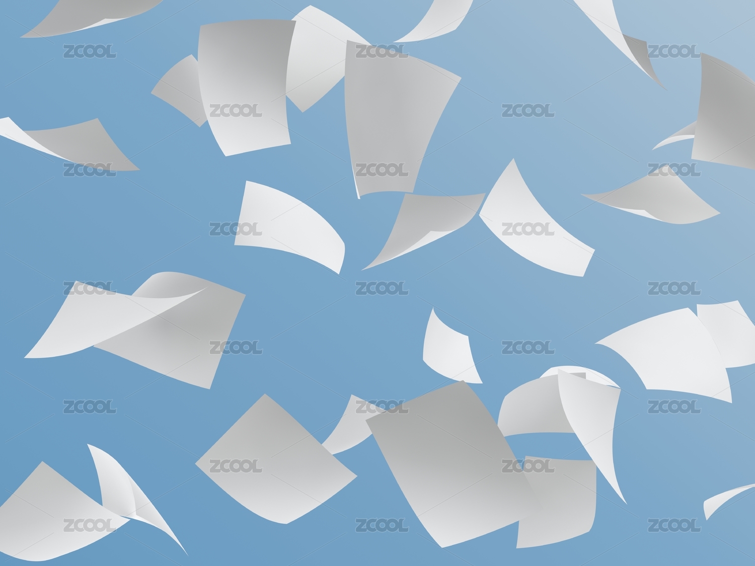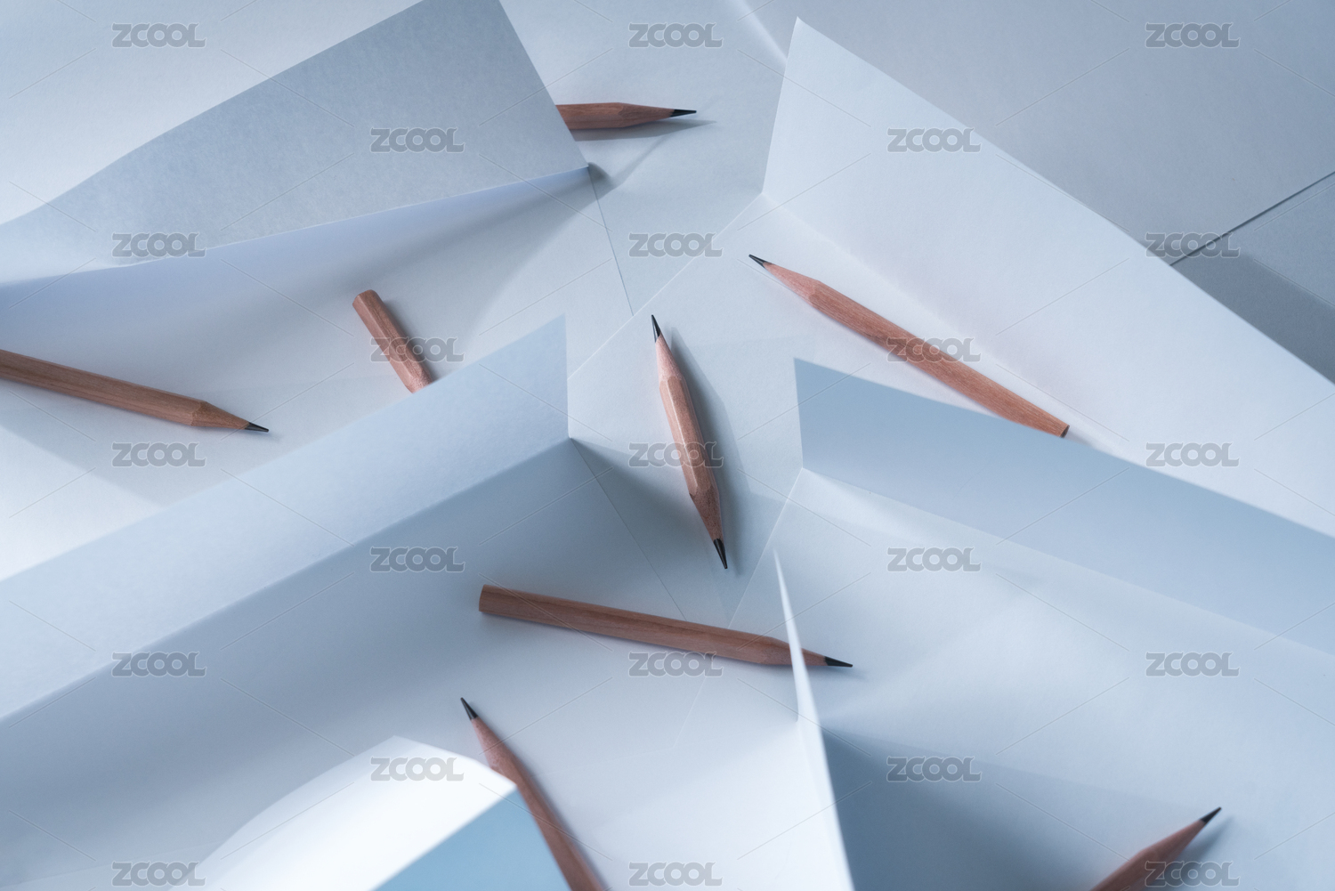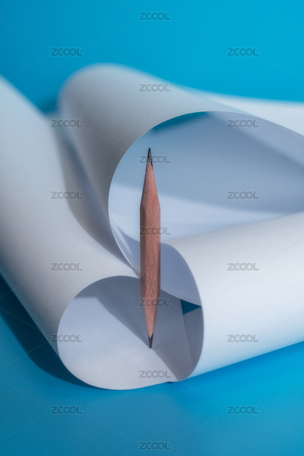蓝色背景中白纸和铅笔塑造的光影曲线