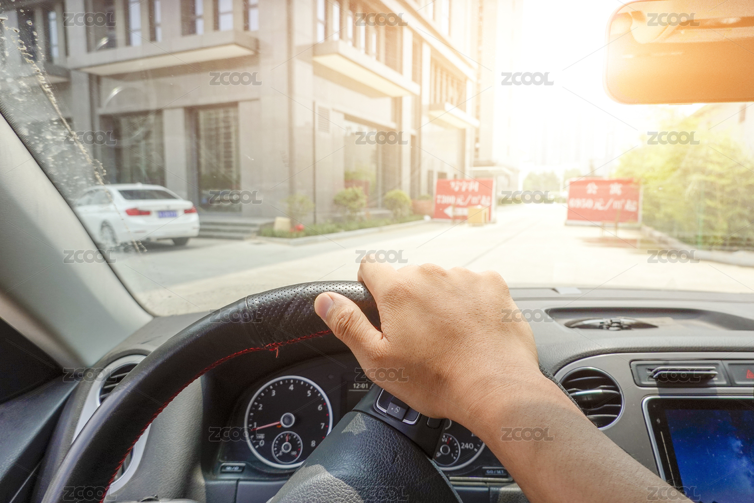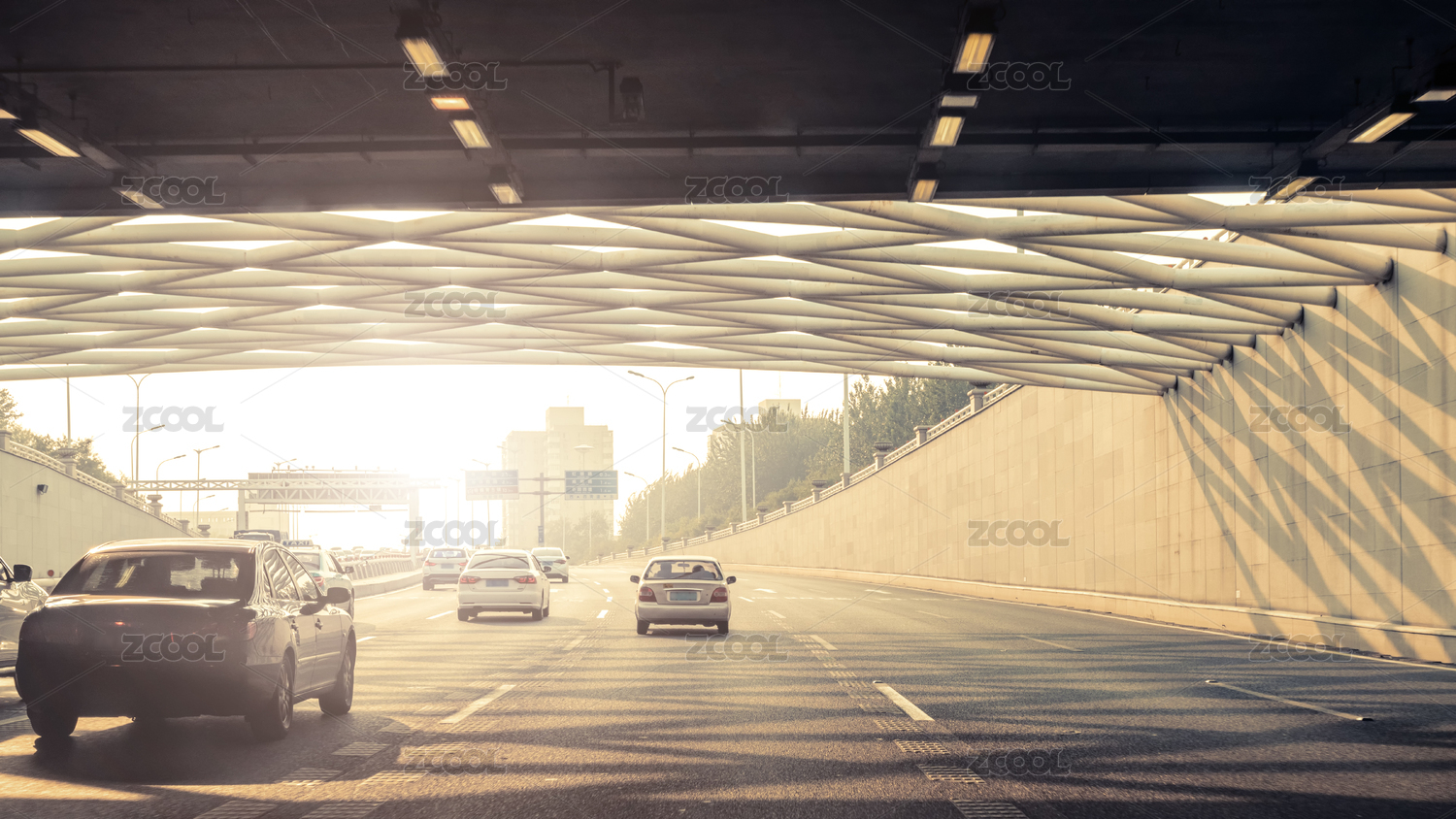 汽车行驶出隧道,暖黄色的光线,第一驾驶视角