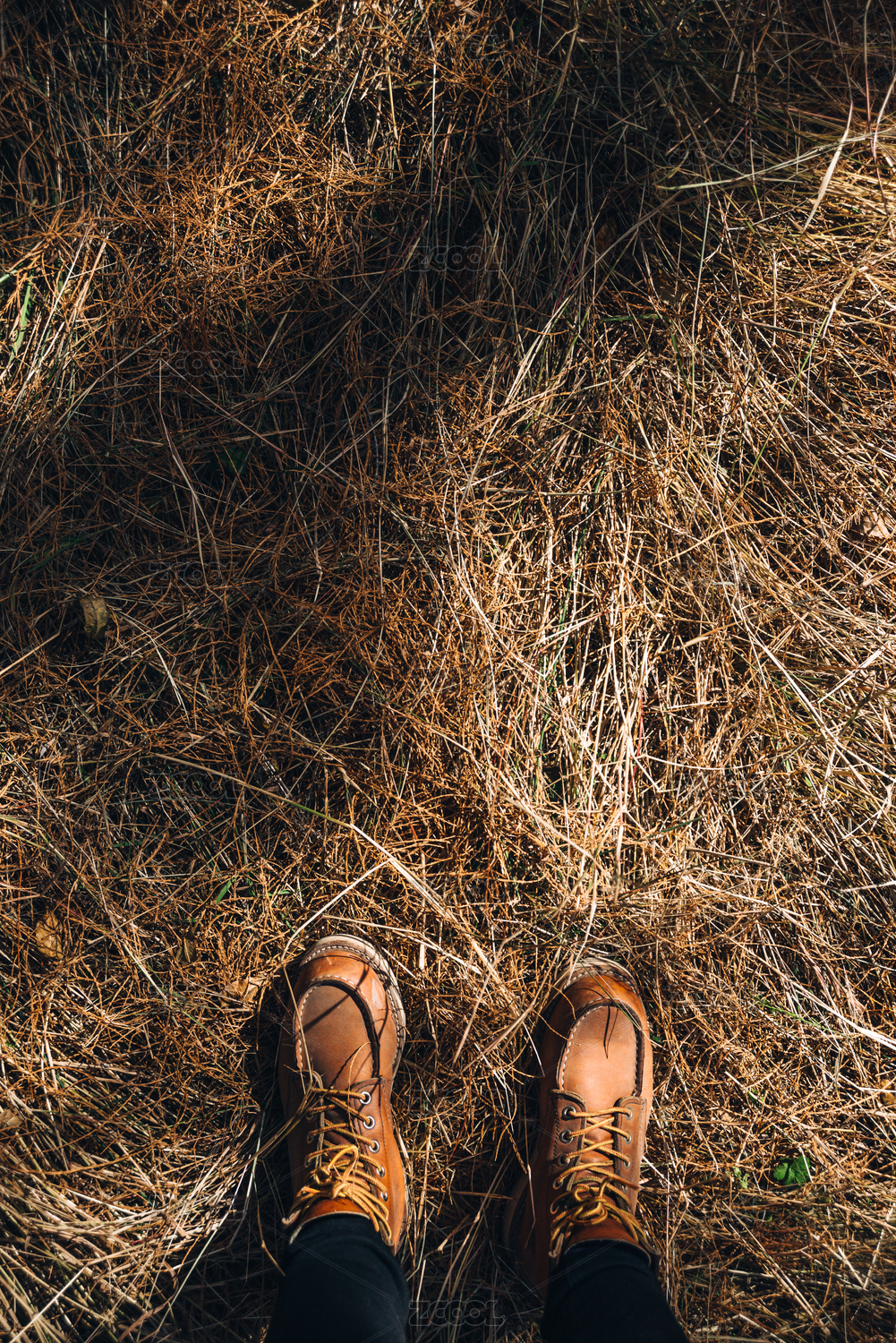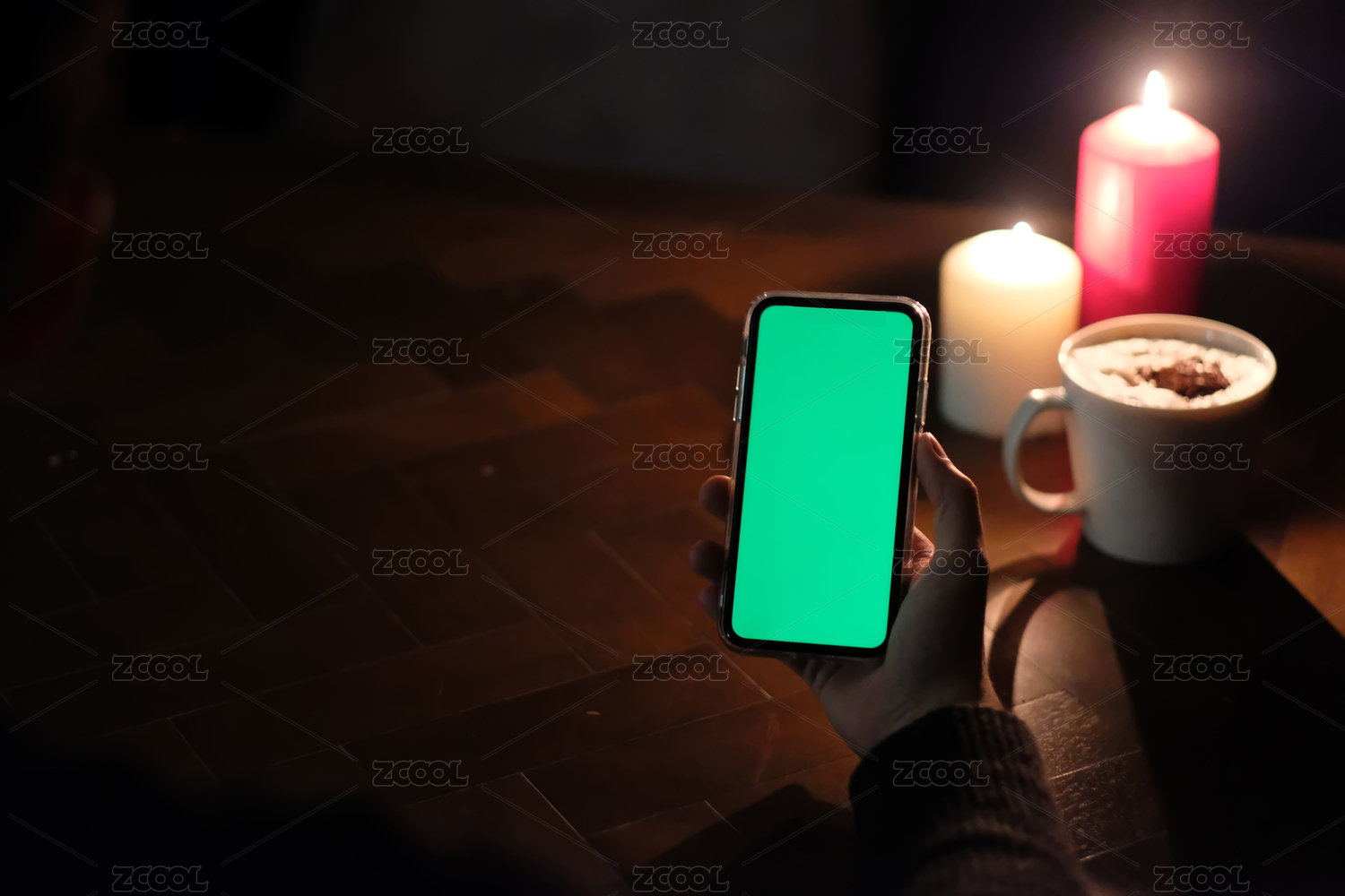 在黄色的桌面上,女性的手拿着空白屏幕的手机,第一视角