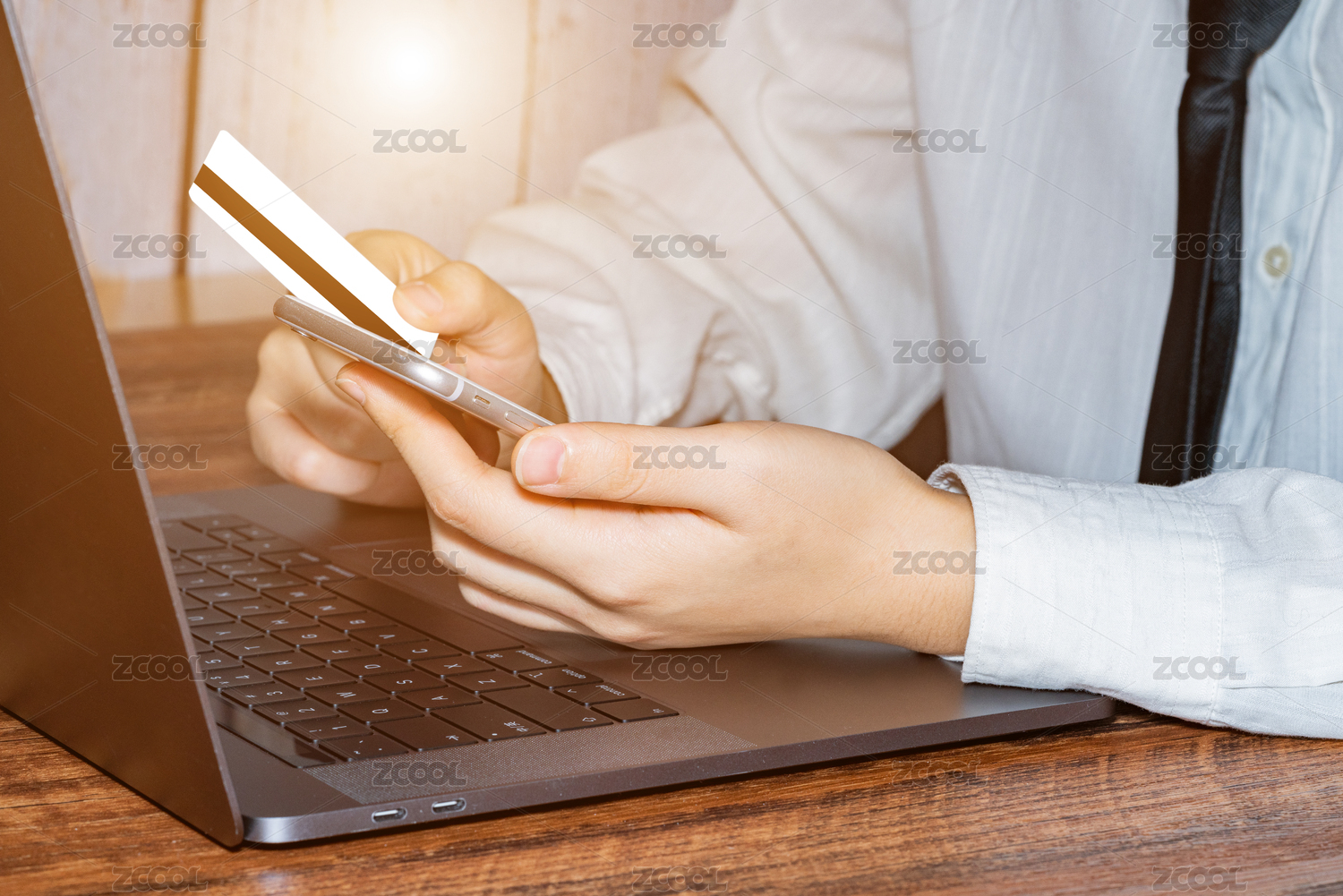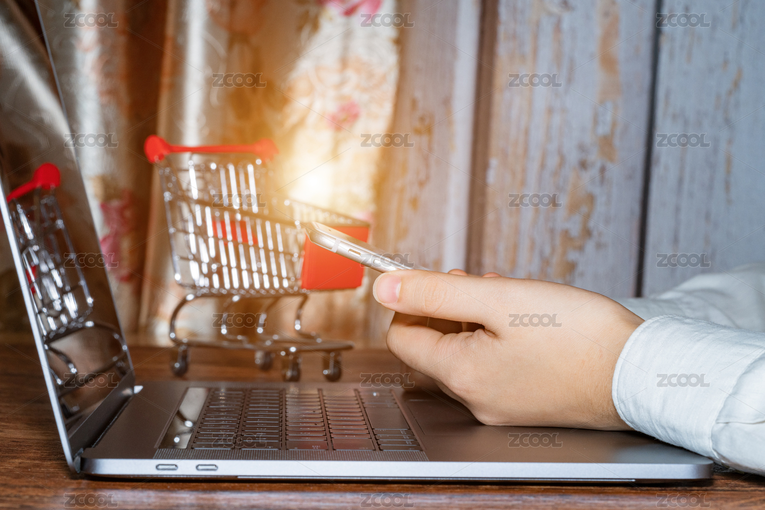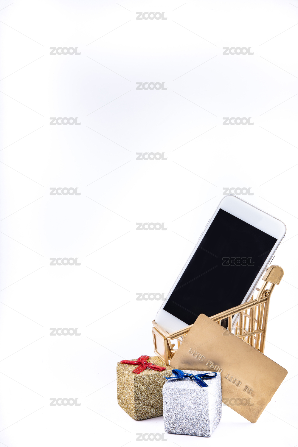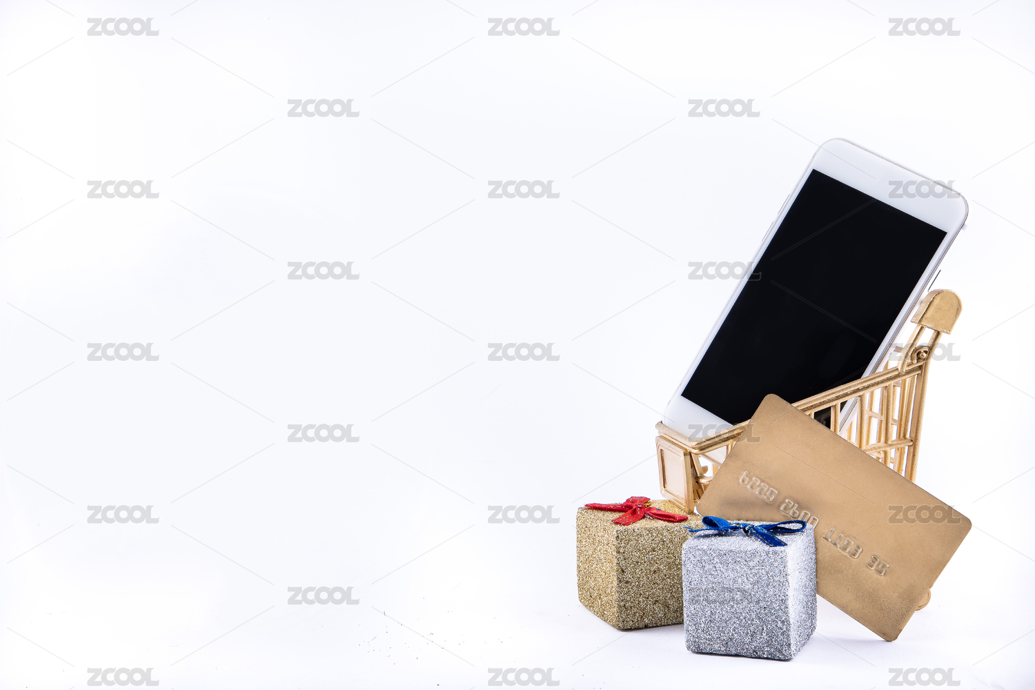 网购主题:白色背景金色购物车上放着一台手机旁边放着礼物盒和金色的信用卡