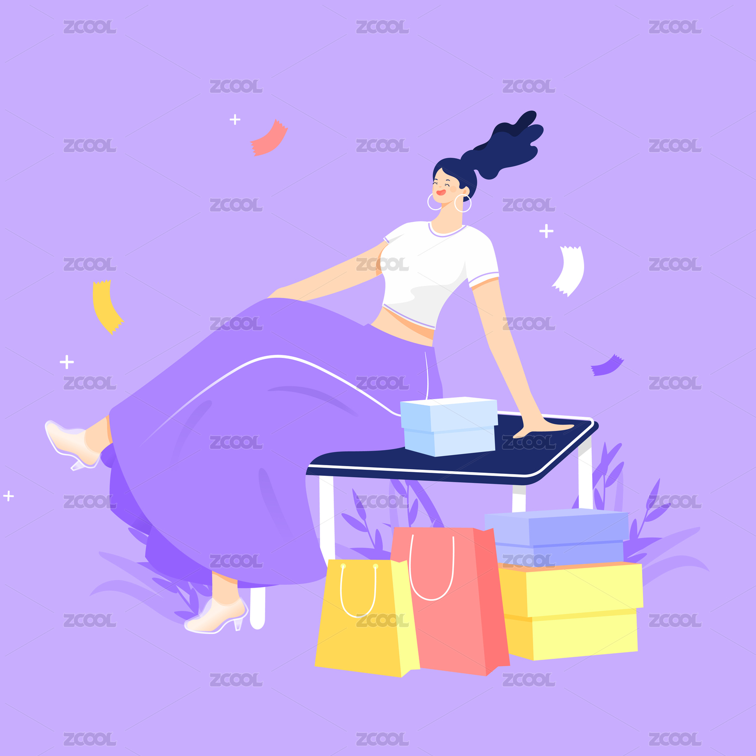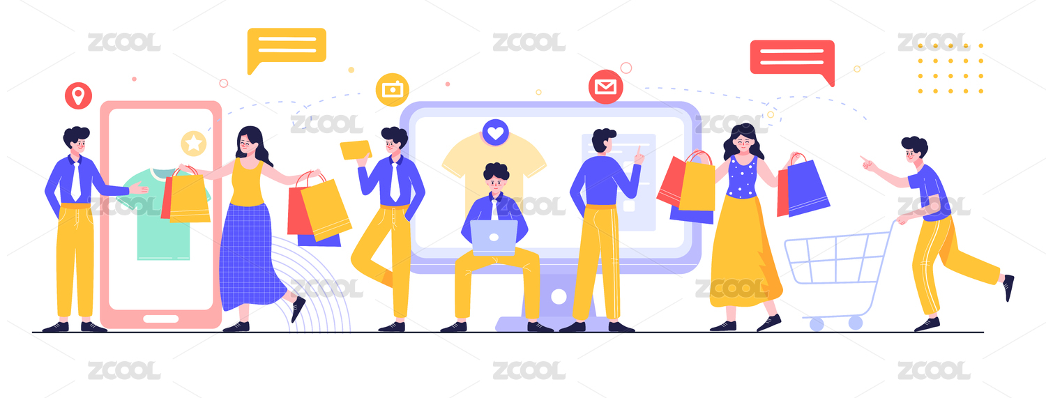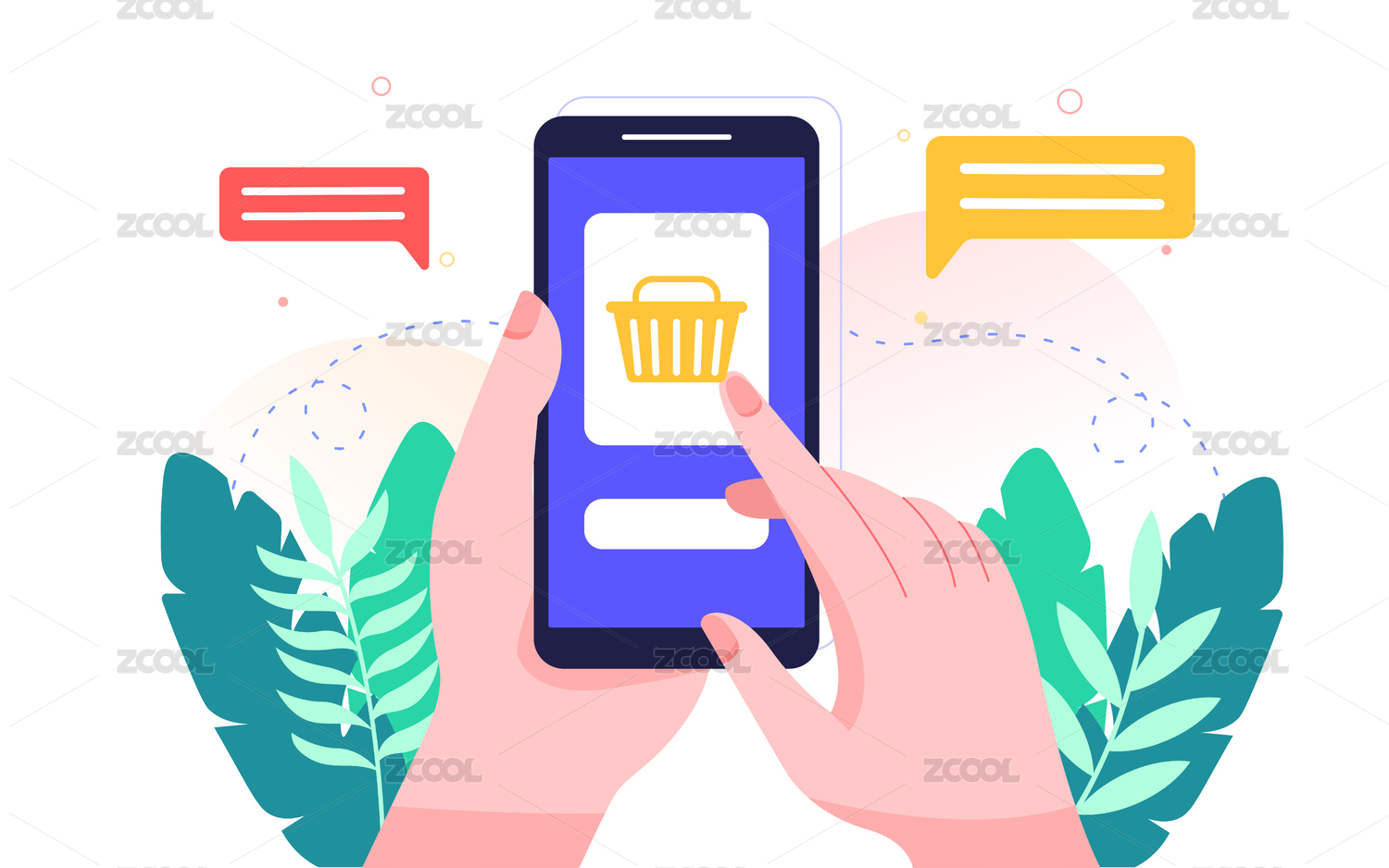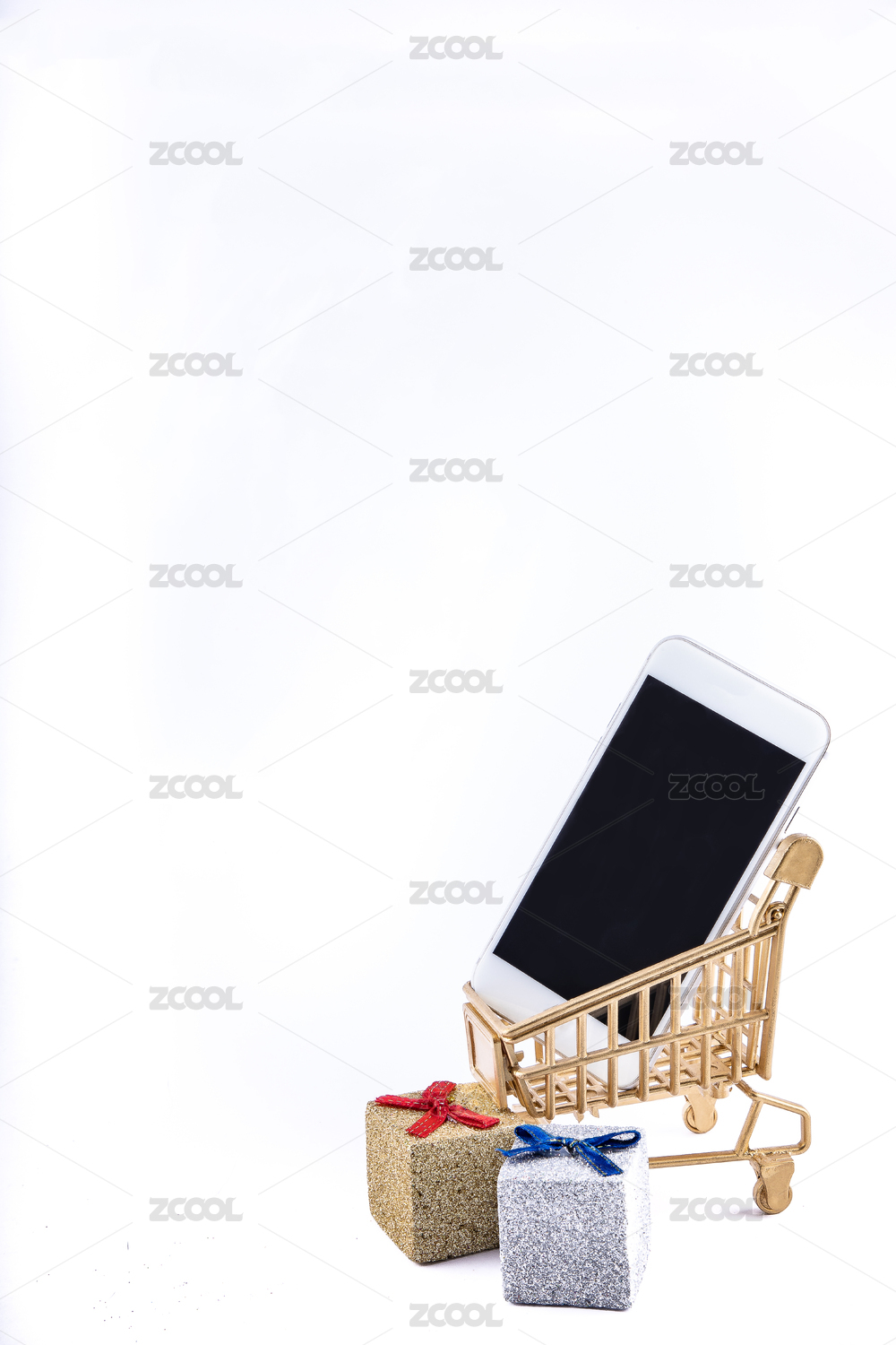 网购主题,白色背景一辆金色购物车上放着一台手机旁边放着礼物盒