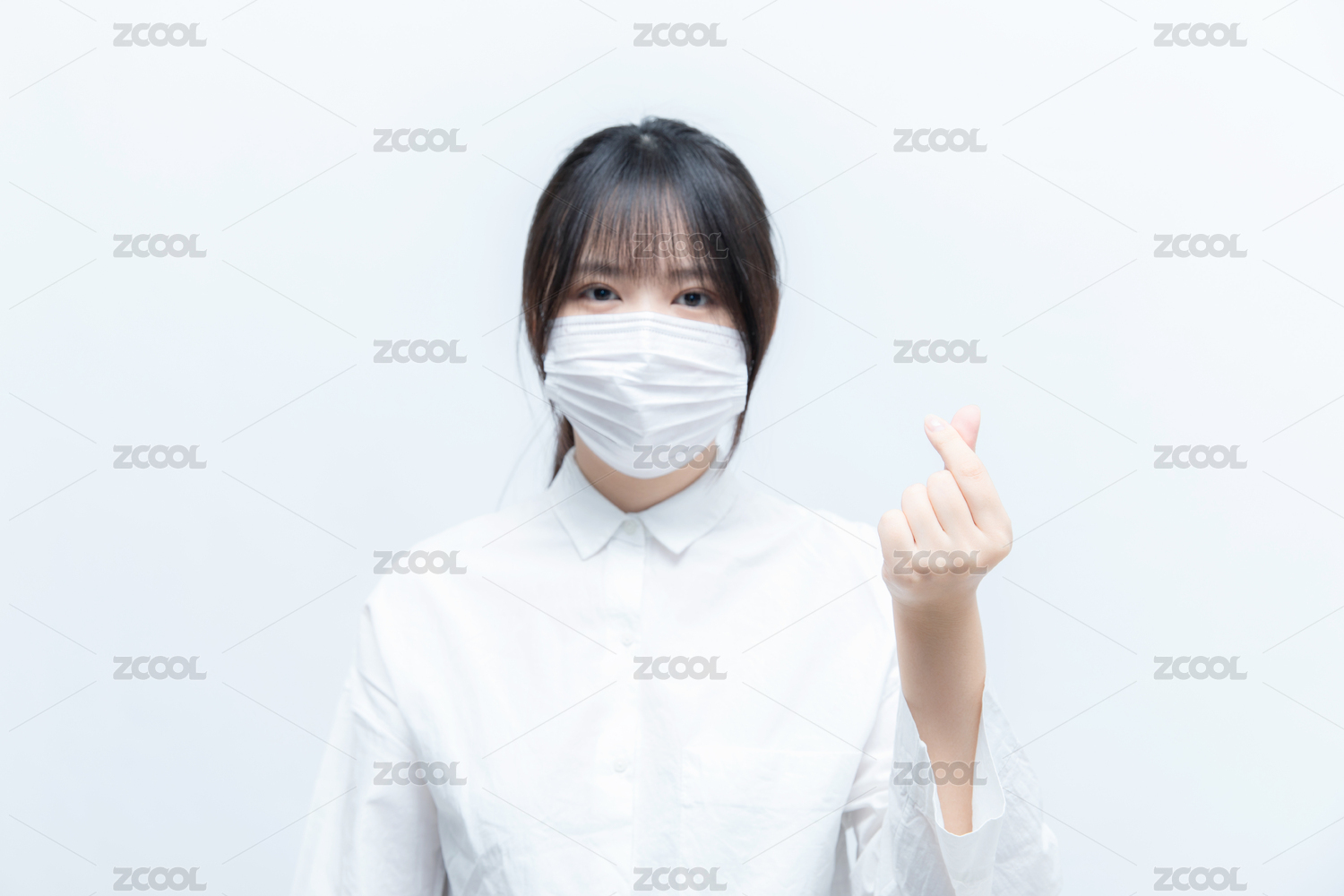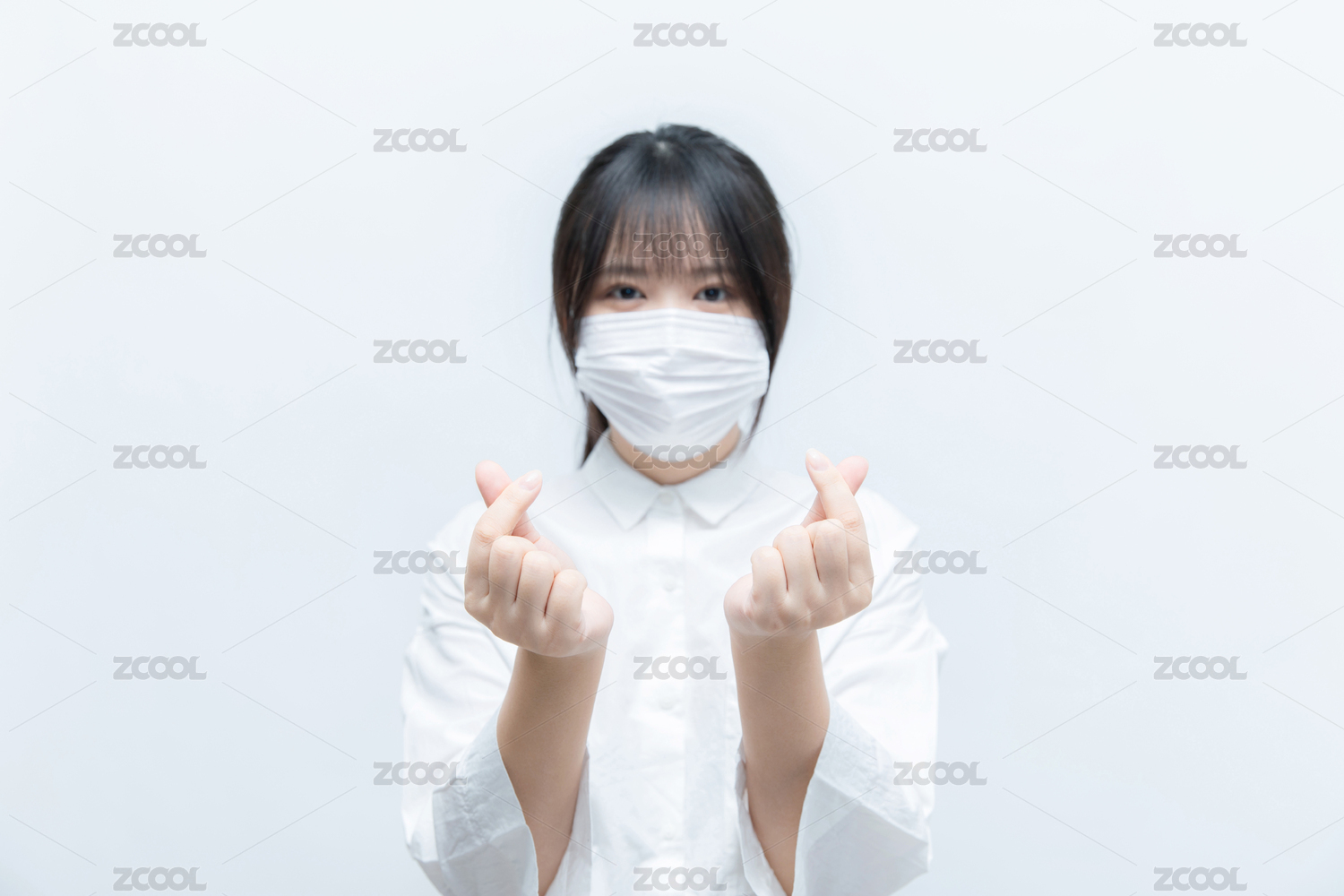 戴口罩的的亚洲东方女生正在用手比心传递爱