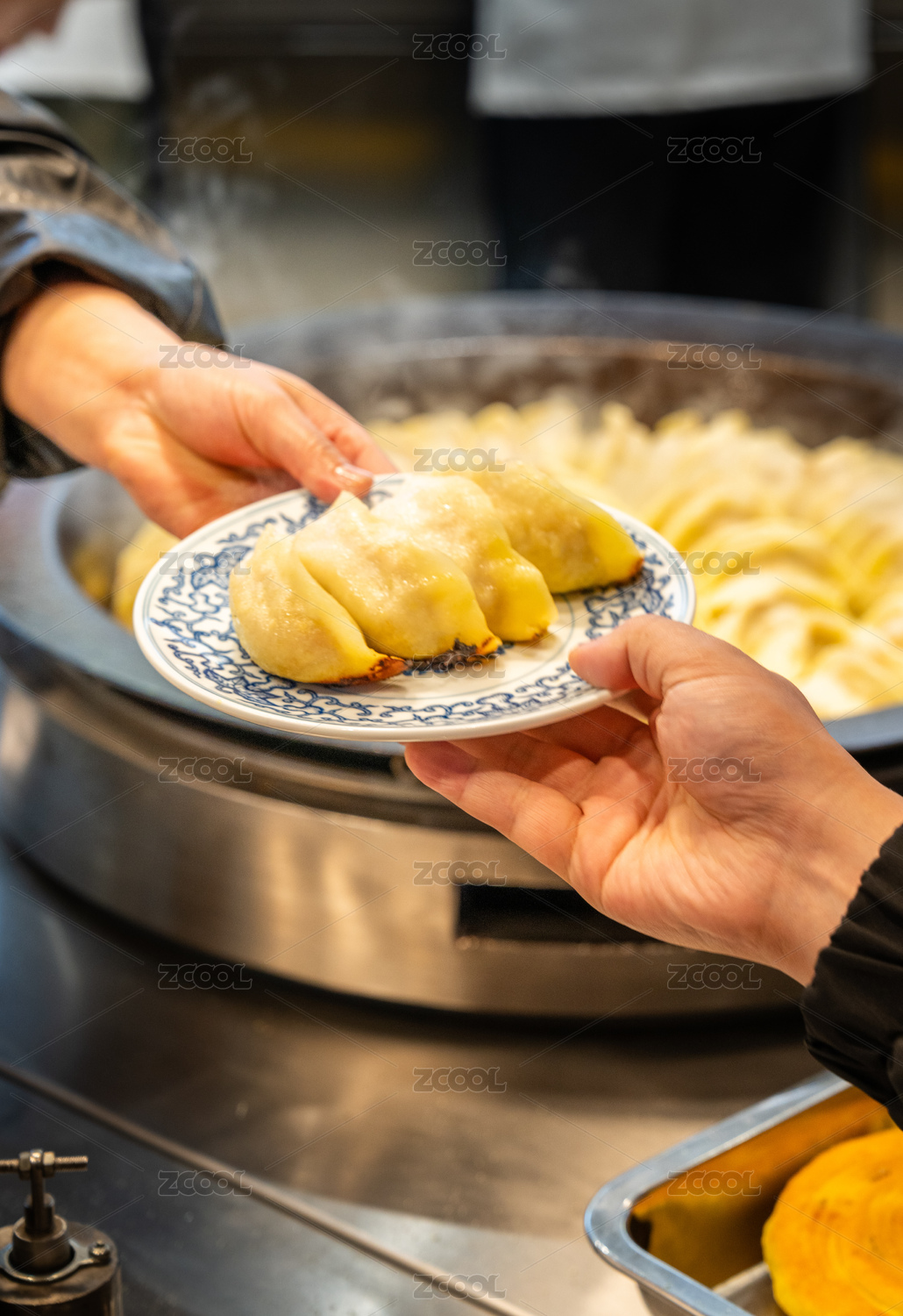 顾客从服务员手中接过一盘锅贴