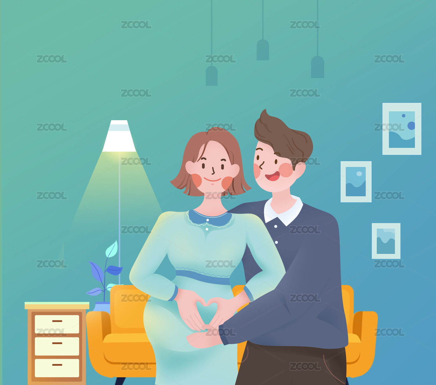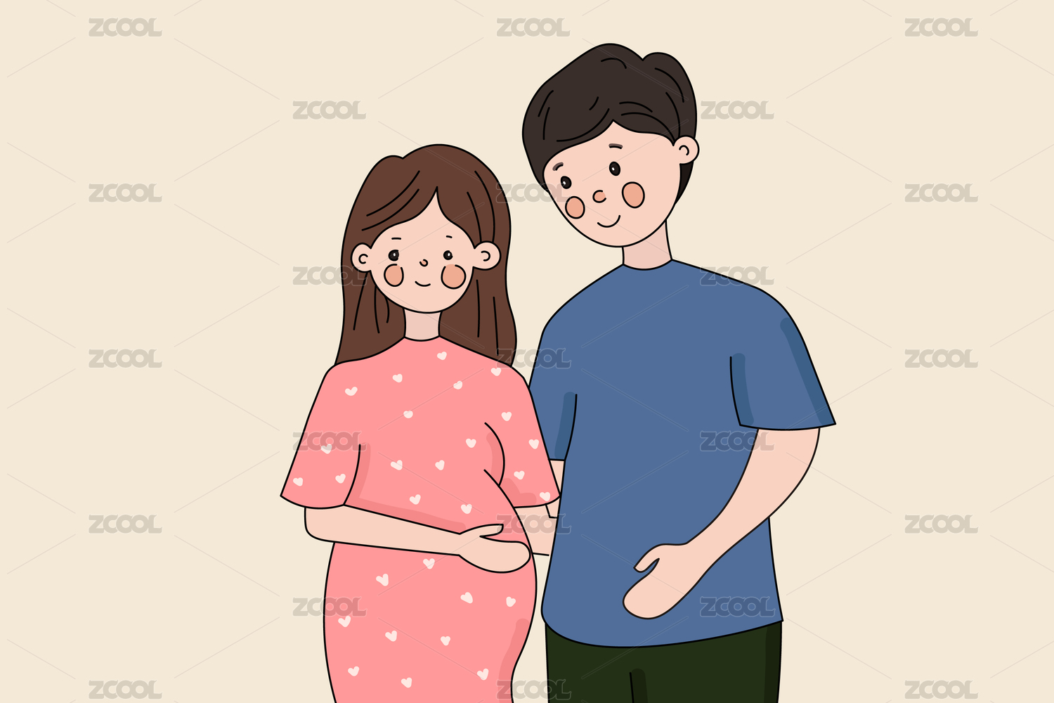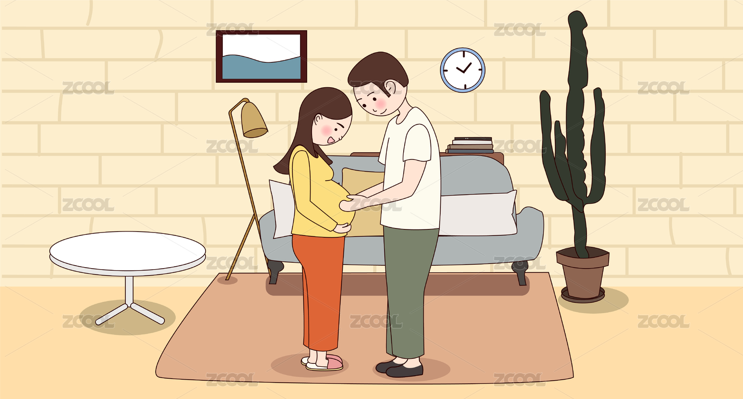 满怀喜悦抚摸妻子怀孕隆起的肚子的丈夫