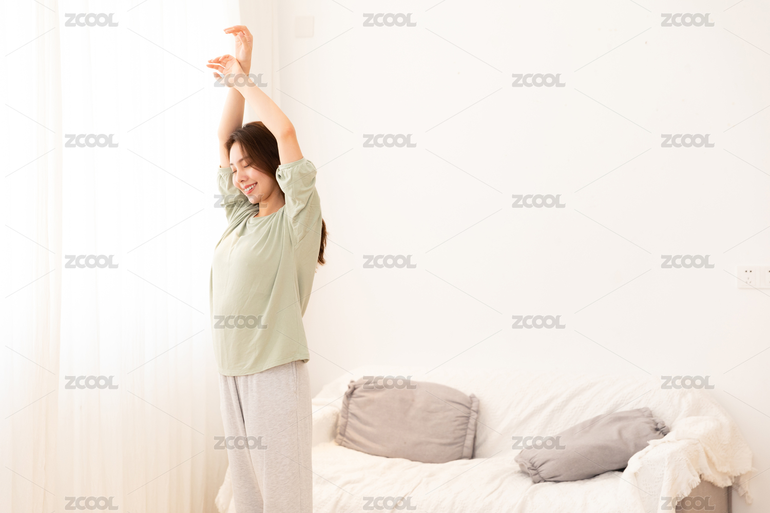居家女性在在窗前伸展肢体