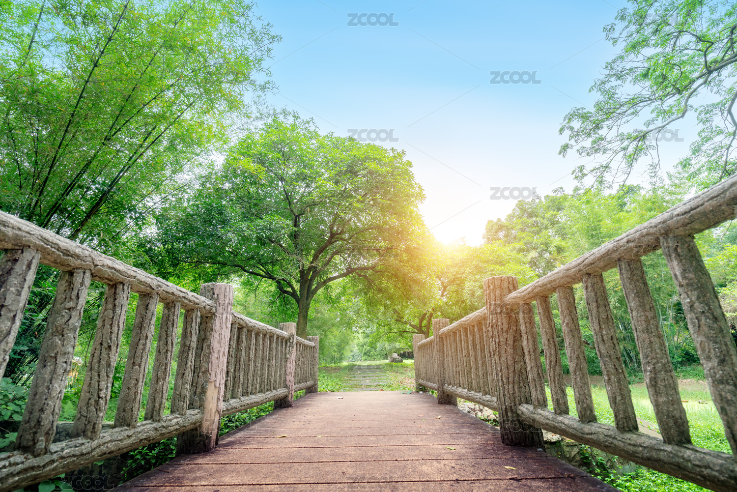 绿色茂盛的森林树木和湖面上的小桥