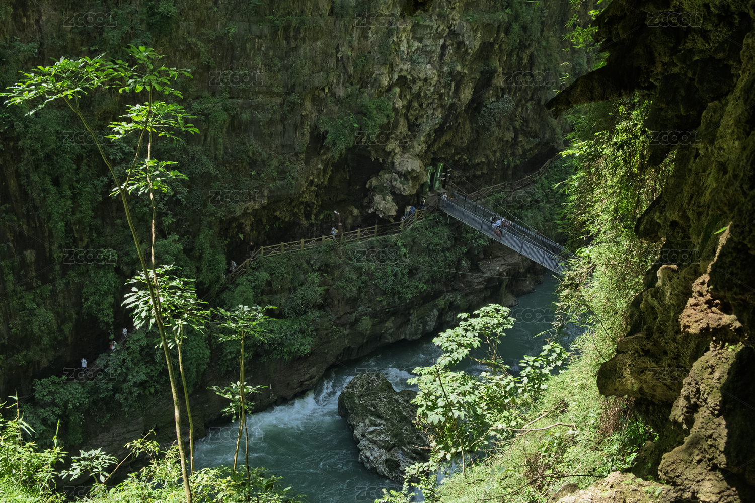 绿色掩映的马岭河峡谷,小桥激流高角度视图