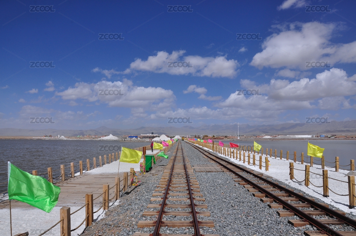 蓝天下茶卡盐湖的湖面小桥和铁路