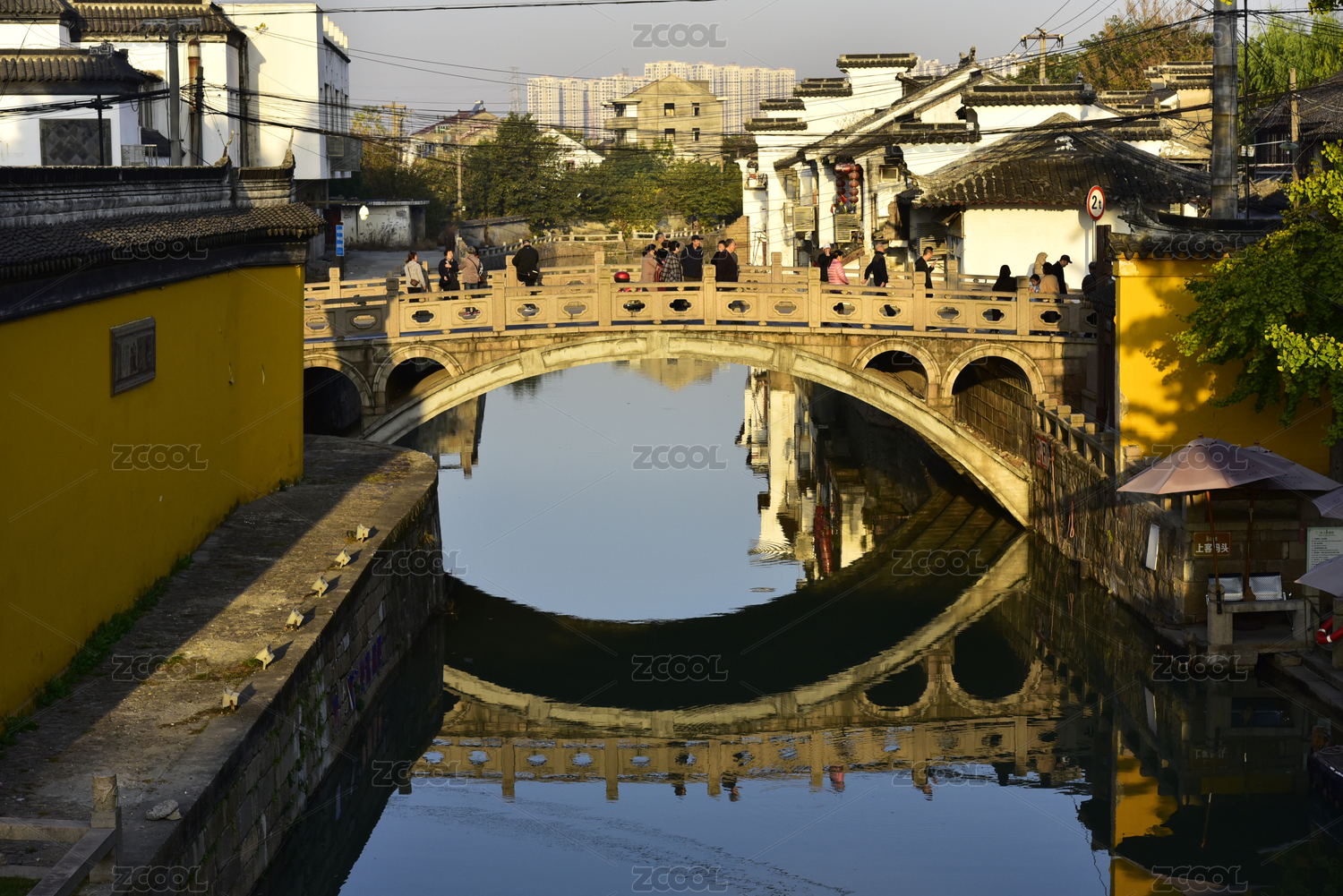 夕阳下的小桥、流水、古风建筑